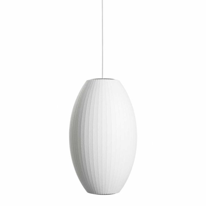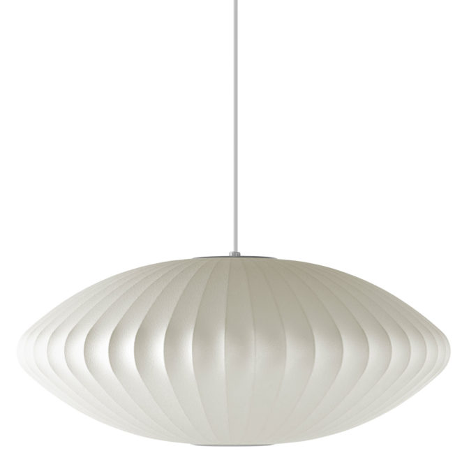 In 1952, George Nelson was inspired by a set of silk-covered Swedish hanging lamps that were lovely, but tedious to produce. He soon went to work designing his own series of lamps—and a more efficient process for making them. He used a resinous lacquer developed by the military for protecting decommissioned ships and planes. After spraying the lacquer over a wire cage, he coated the form in plastic to create a smooth, translucent skin. Today, Nelson Bubble Lamps are made the same way, with slight updates to extend their durability.