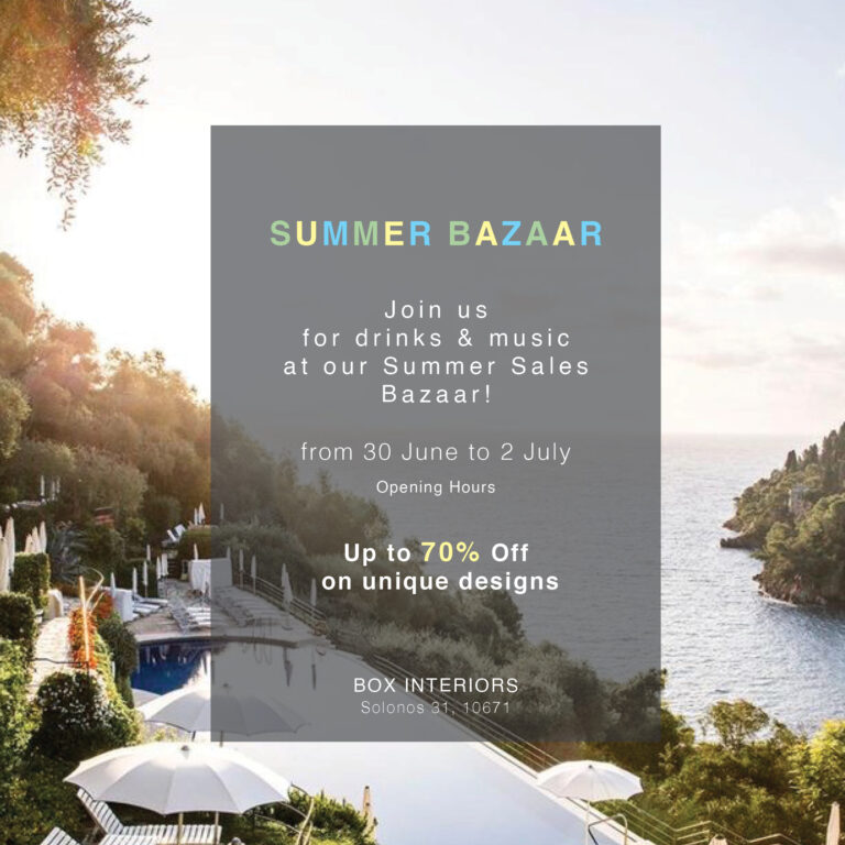 SUMMER BAZAAR Join Us for drinks & music at our Summer Sales Bazaar! From 30 June to 2 July Opening Hours Up to 70% off on unique designs BOX INTERIORS 31 Solonos, 106 71