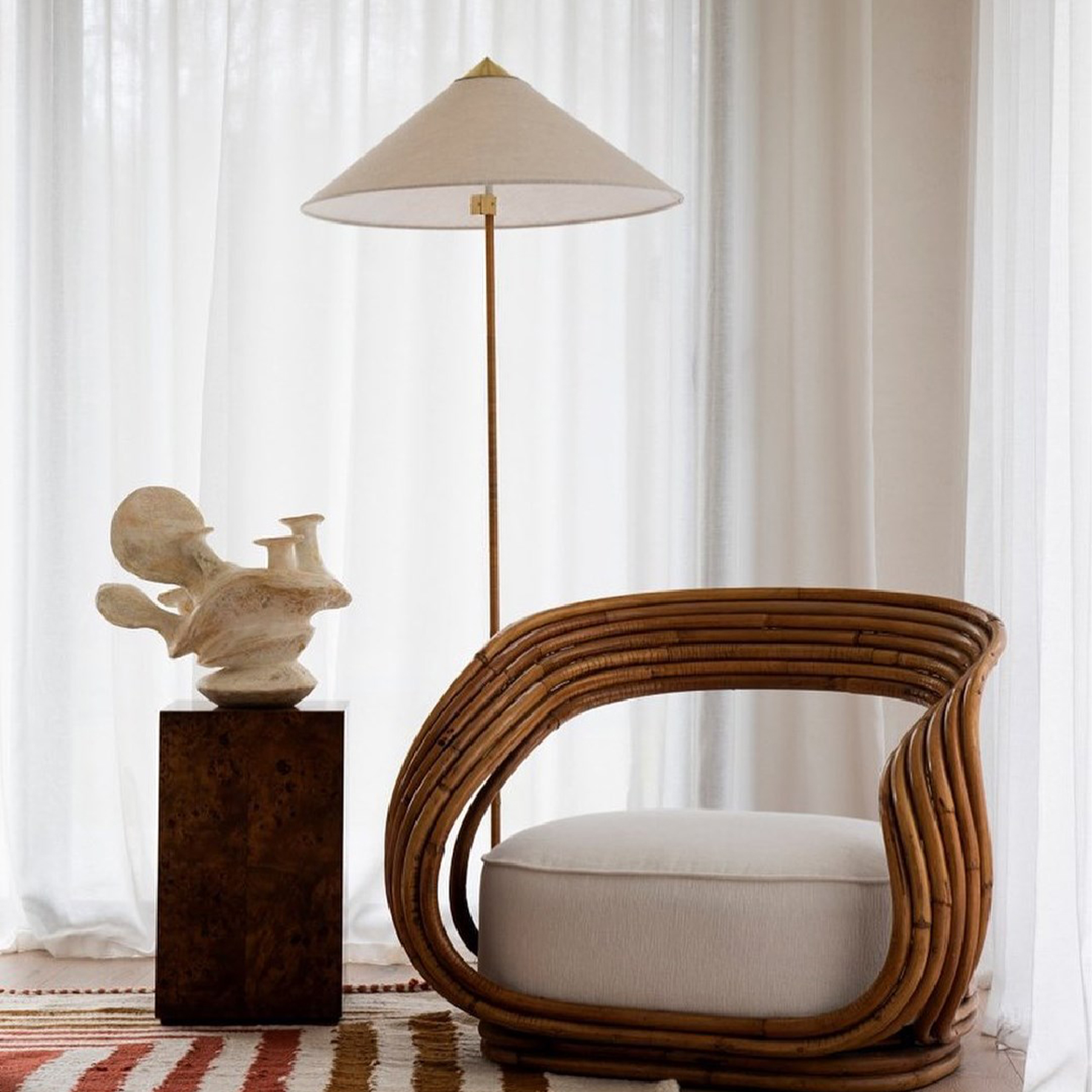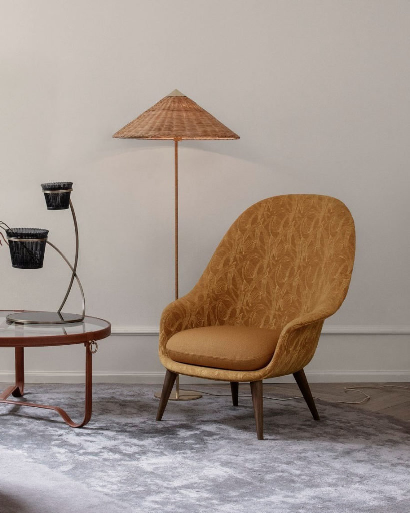 The 9602 Floor Lamp, also known as “Chinese Hat” was designed by Paavo Tynell in 1935 for the Hotel Aulanko. Characterised by its elegant and airy lampshade and rattan-covered stem, the 9602 Floor Lamp shows the designer’s limitless imagination and unparalleled ability to create designs of enduring beauty. Adding a playful, exuberant quality to the top, balanced by the more static form of the base, the 9602 Floor Lamp is perfectly suited for creating a gentle ambient light in the domestic living room.