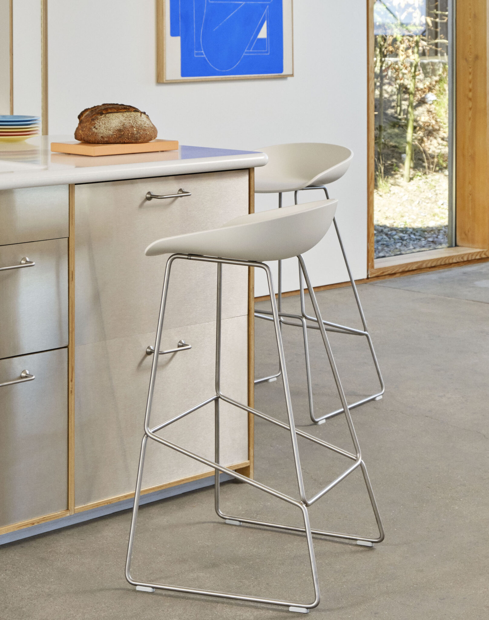 The bar stool About A Stool AAS 38 has the same capacity for transformation as the other members in the series, ranging from a minimalistic plastic stool to a more full-bodied upholstered version. The curved backrest is balanced on an elegant rounded frame in metal, showcasing a more industrial design with a strong visual presence. Suitable for as using as a bar stool in bars and restaurants, as well as at home for informal meals. Available in two heights and a wide range of metal finishes and colors.