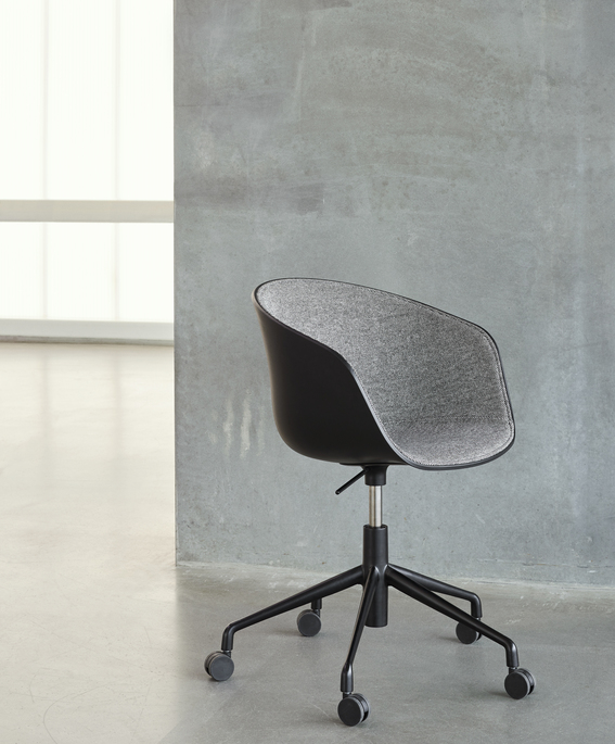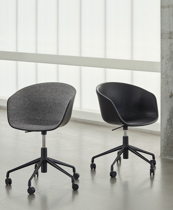 Perhaps the most functional chair of the series, the About A Chair AAC52 features a five-legged castor base equipped with a semi-automatic gas lift that can adjust the seat height from 42 to 56 cm. Just like the rest of the series, the aluminium base can be combined with the original, open seat or rounded shell to make the look as formal or relaxed as you like. A wide choice of colours and fabrics give you further options to adapt the chair to whatever environment you need.