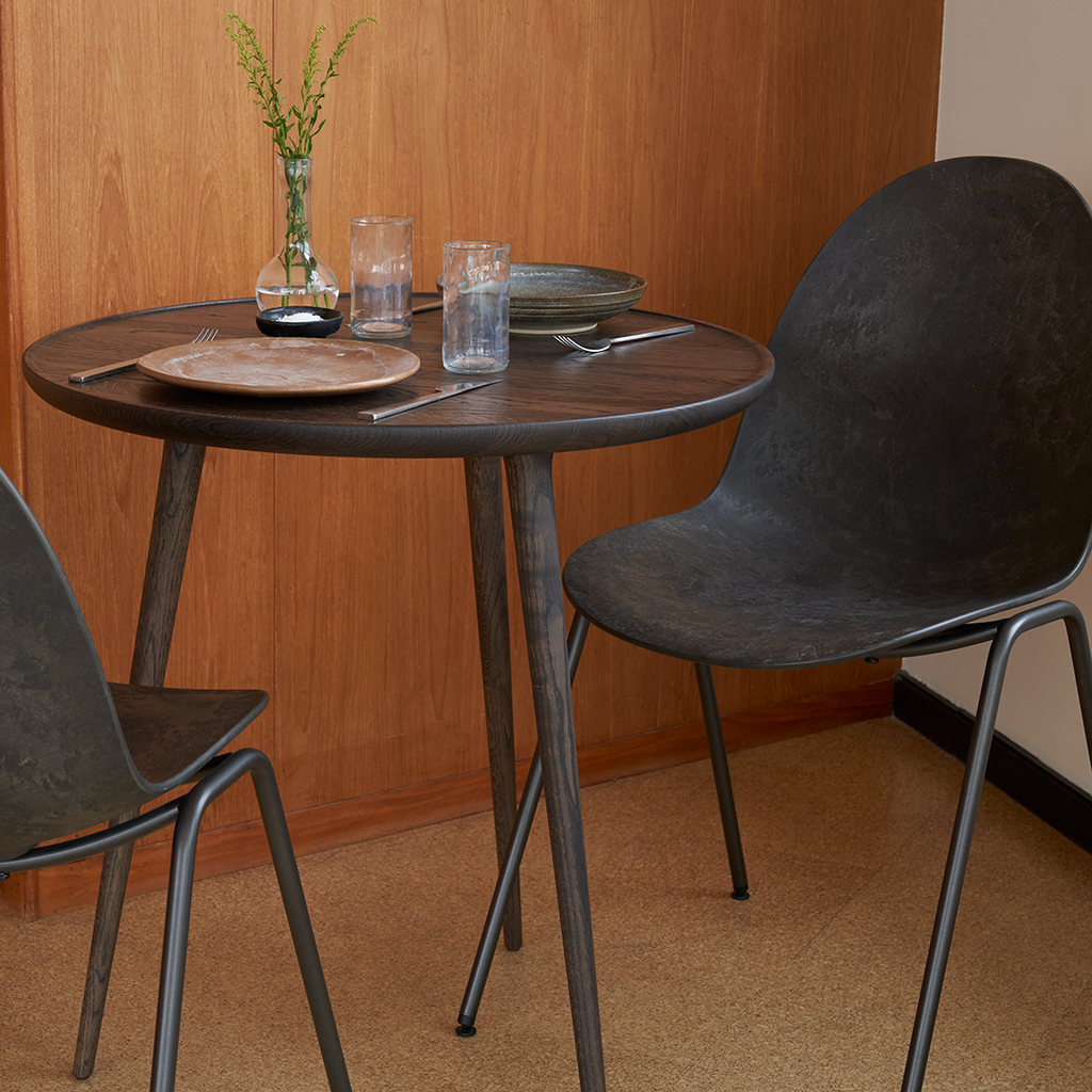 The Mater Accent Dining Table is designed by the Danish architect duo Space Copenhagen and combines a sculptural and handcrafted aesthetic. Following along the same bloodline as the highly successful 2009 Mater High Stool, the Accent collection consists of three coffee tables, a larger oval lounge table, a café table and round dining table. Crafted in solid FSC certified oak with a sirka grey stain.
