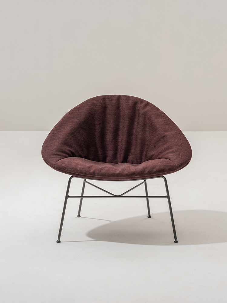 Lounge chair on a four-legged base in painted steel. Polypropylene shell with distinctive texture made with 80% recycled materials, available in four colours.