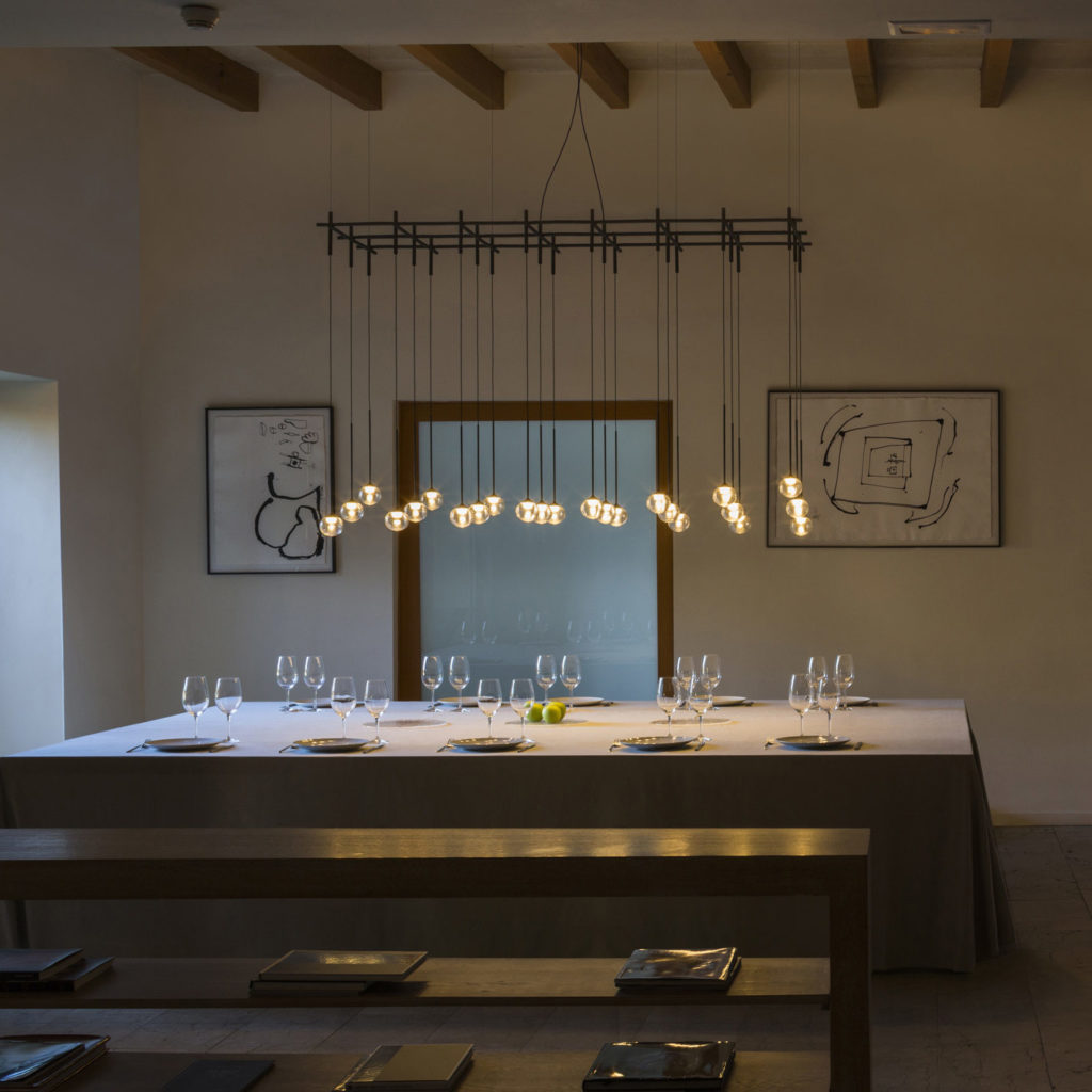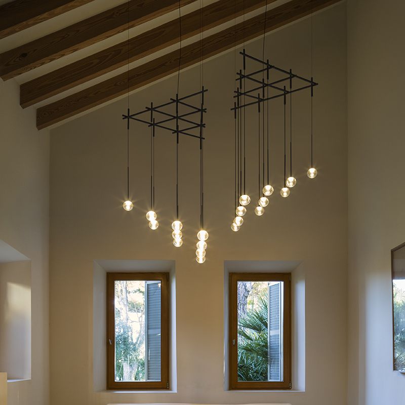 Toan Nguyen is the designer of the Algorithm lamp collection. This collection fuses beauty and geometry within a lighting system filled with magic. Vibia offers a group of pendant lamps where the user can choose between predefined references or create their own configuration of the product in order to adapt perfectly to the space in question. The Algorithm collection is composed of configurations of spheres of LED light suspended at different heights and attached to the ceiling via a floating tubular structure.