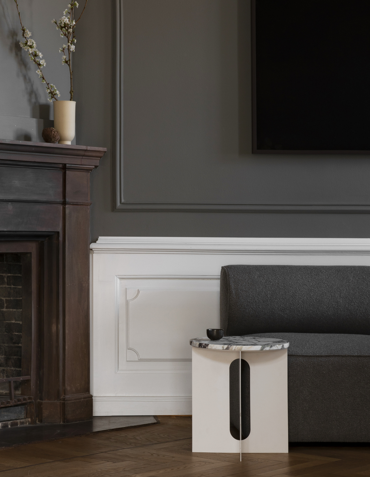 The perfectly proportioned table comprises a sturdy powder-coated steel base on which a rounded marble tabletop is balanced. The table’s refined marble top, which barely hangs over the legs to create an overall sense of balance, and contrasting wide, flat legs – laser-cut for precision – make it an easy fit for a range of décor styles. Both base and top are available separately and in ivory or black powder coated steel and white or black marble respectively for total customization.