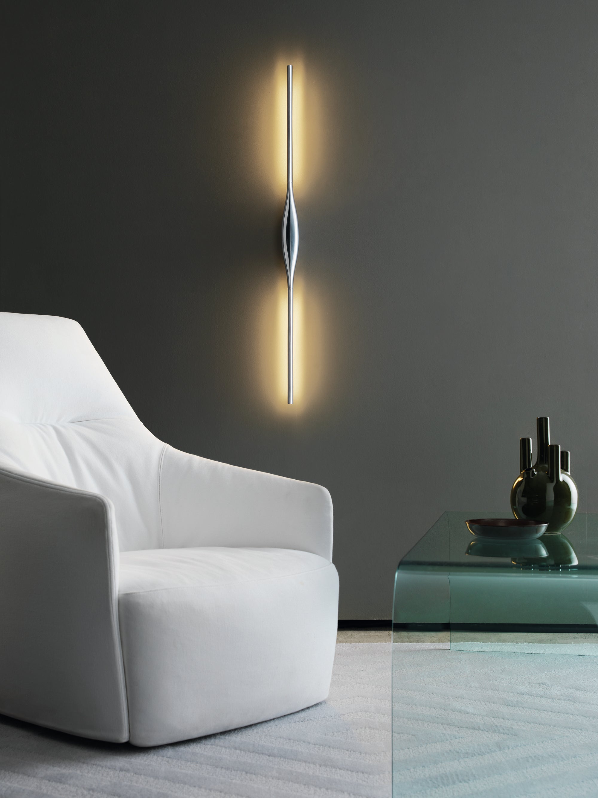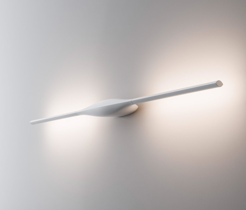 Apex is a wall lamp that is distinguished by its elegant, streamlined design and eye-shaped center. Each end of the lighting fi xture tapers off and almost disappears into its surroundings, while at the same time emitting a powerful, functional blade of light. Apex can be installed horizontally or vertically.