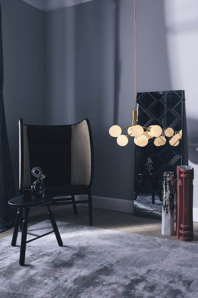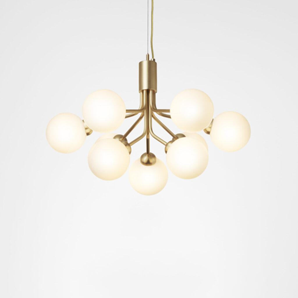 With inspiration from flowers, Sofie Refer has designed the new chandelier collection, Apiales. The collection consists of two chandeliers with 9 or 18 mouth-blown glass globes and are available in golden Brush Brass finish or the smooth Satin Black. From a specially-produced canopy, the arms unfold like flower stalks from which light is spread with grace. Apiales 9, with its 60 cm in diameter, fits over the dining table, in the bedroom, or in the hall.