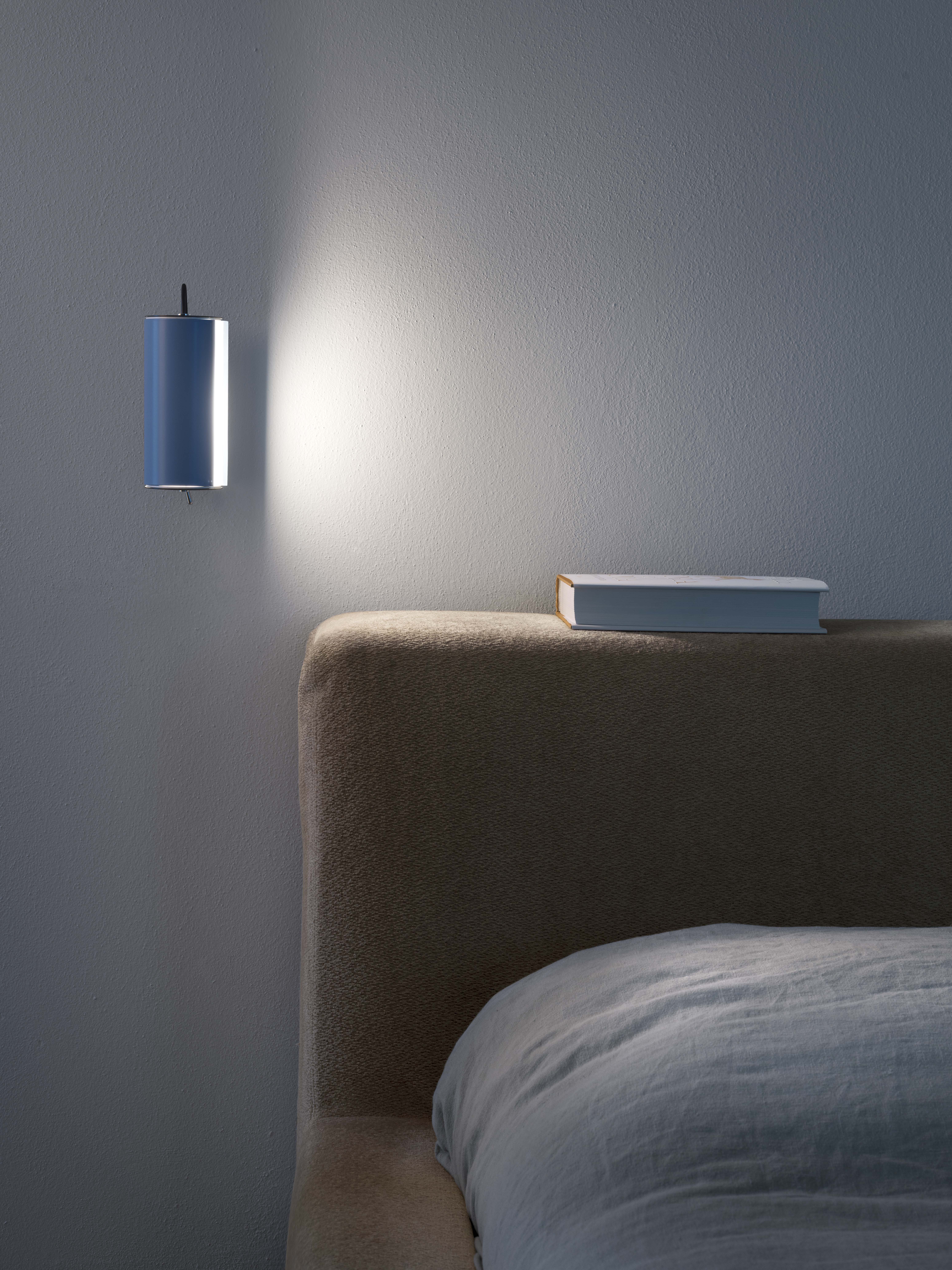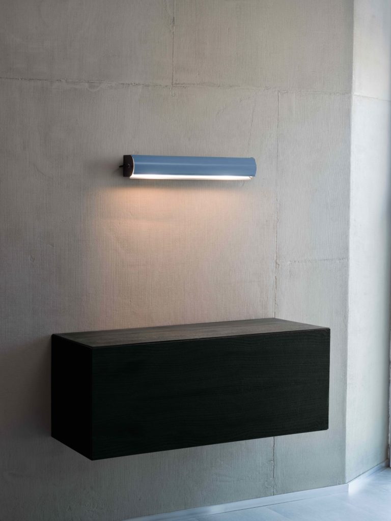 LED wall lamp with cylindrical lampshade available in two sizes (Longue e Petite) in light blue painted metal. Perriand’s interest in pivoting screens reflects his observation on human gestures: a simple touch allows the light beam to be controlled and directed.