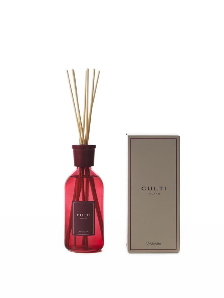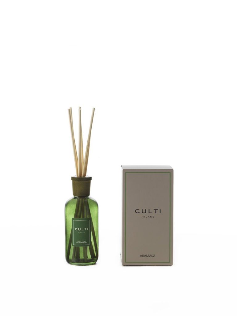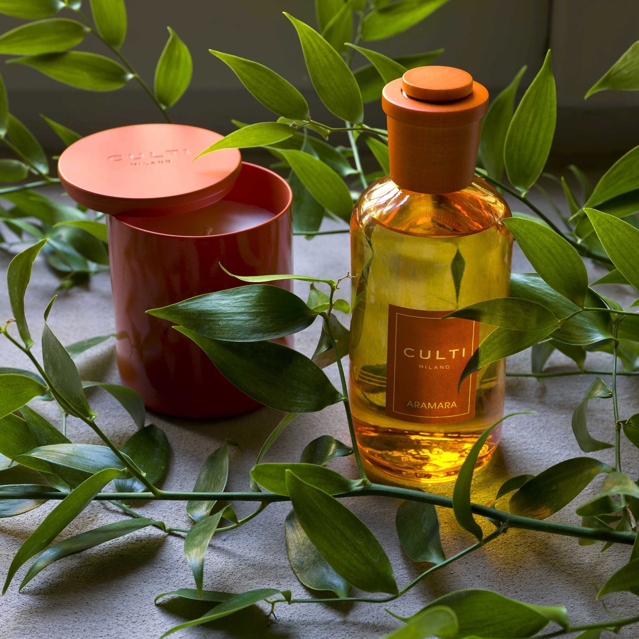 Clear coloured glass bottles with coloured labels and Ruby Red maple wood cap. The CULTI COLOURS line is a delightful burst of energy that livens up every room. Aramara: A sunny day in the countryside, infused with the reassuring aroma of citrus peel. The scent of the fruits is dispersed and remains suspended between a pleasant bitterness and a candied sweetness, just like some of life’s moments.