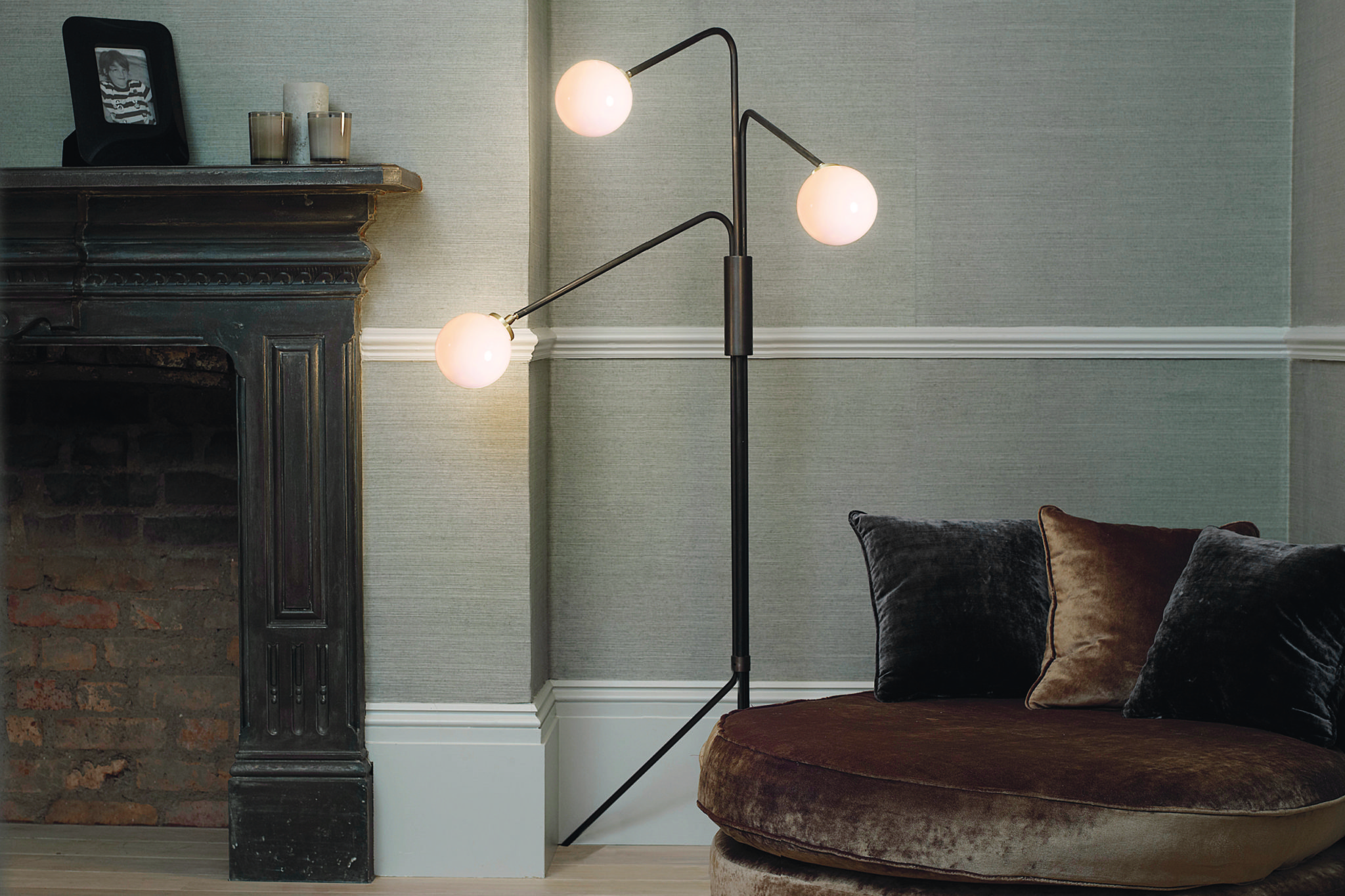 This sculptural light is both modern and retro. Its distinctive form with multiple arms furnish a space with great style. The metalwork is brass, then bronzed and hand waxed which contrasts with the brass detailing. The moveable glass spheres give a wonderful diffuse glow and creates a beautiful soft glow at night.