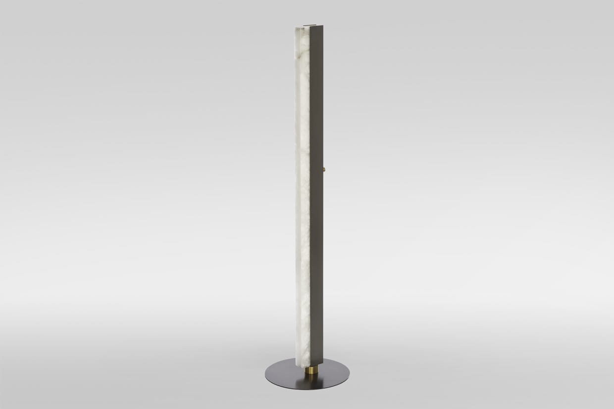 An architectural beam of light fused with premium materials such as bronze, satin brass and honed alabaster creates an elegant floor light which illuminates an interior and can be dimmed.
