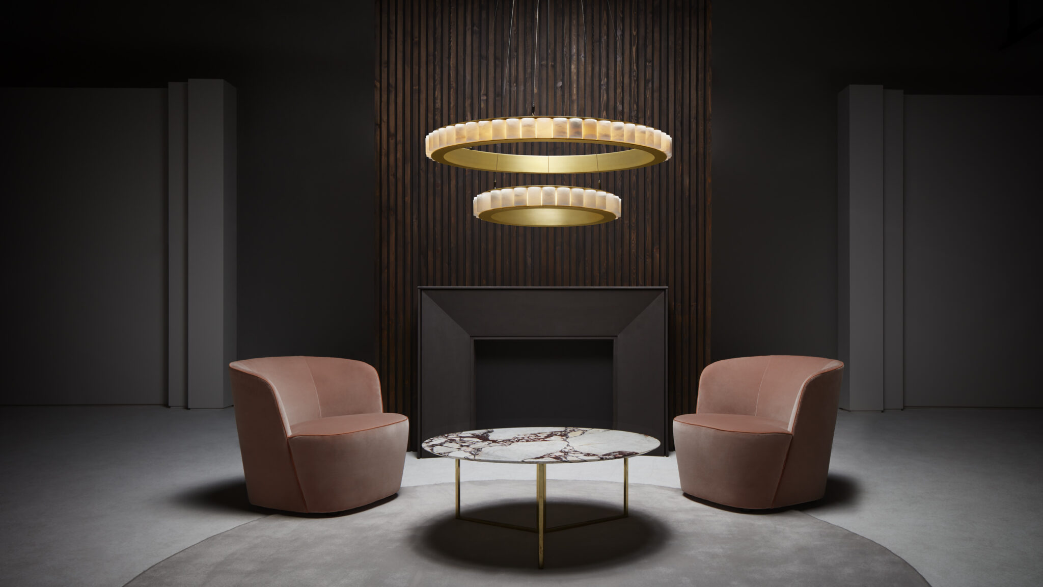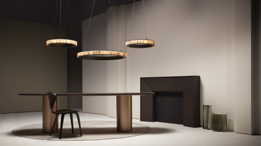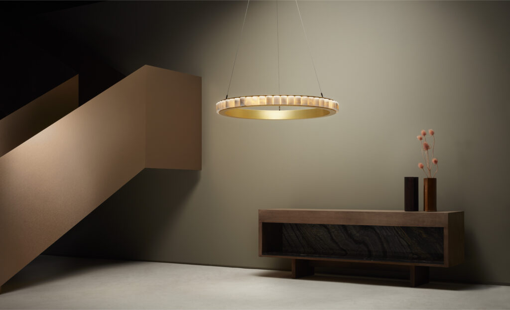 Inspired by the legendary island, from where mystical stories of light and shadows have enchanted the world for centuries, AVALON showcases cascades of light emanating from a precious ring of alabaster, encapsulated in brass or bronze creating an exquisite illumination.