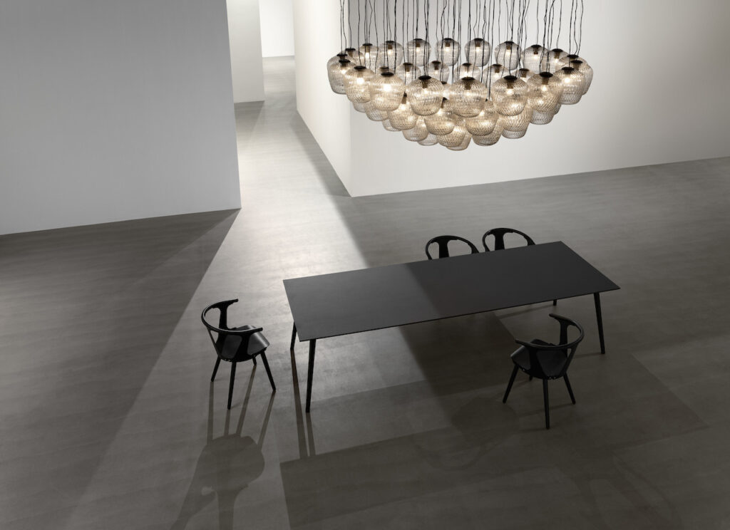 Blown is Samuel Wilkinson’s first lamp for &tradition. A mouth-blown pendant with a quilted pattern, it comes in two versions: a translucent variant with a silver lustre and a sandblasted white one. The pendant is fitted with a powder-coated cast metal suspension. The pendant was conceived as an exploration of the reflections, distortions, and refractions of a light source when surrounded by patterned glass.