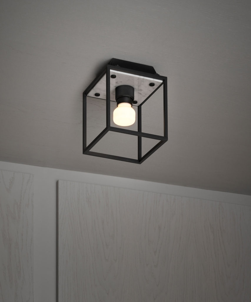 A ceiling light made from a matt black metal cage and comes with a SATIN BLACK or WHITE MARBLE back panel.