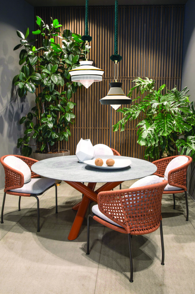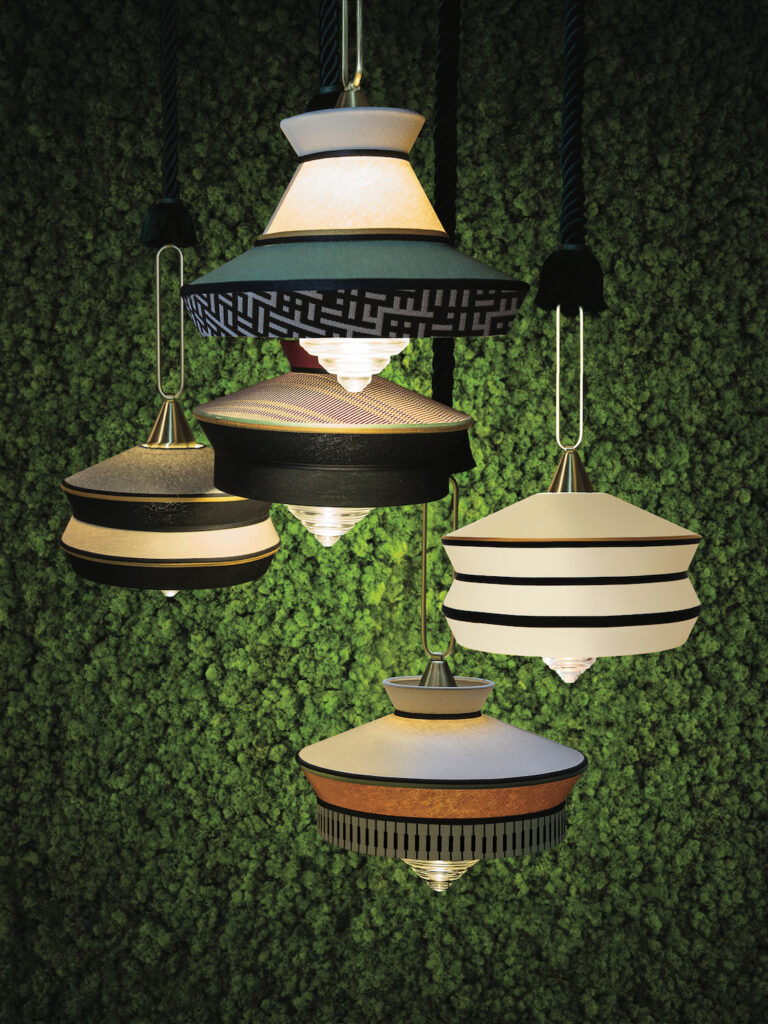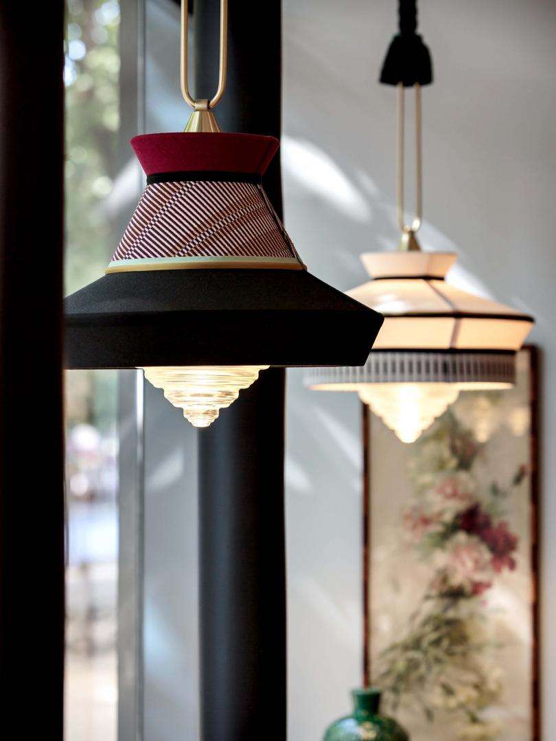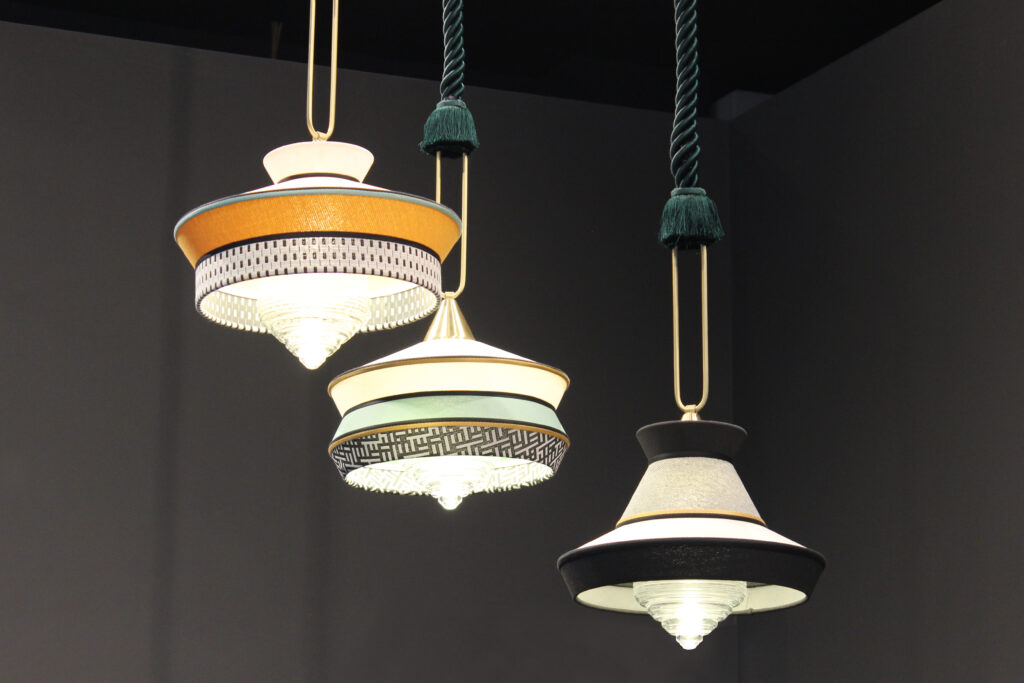 Calypso is a collection of suspensions inspired by the art deco period, with fabrics whose textures and white and black geometric patterns mix with bright colours of South American and tropical culture, providing a very original result. The indoor version is characterised by a green braided silk rope. The metal support is a satin brass finished ring. The diffuser is in transparent glass.