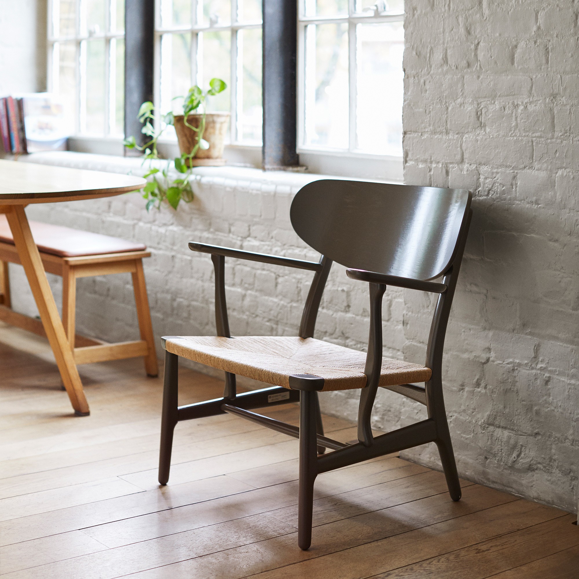 The CH22 lounge chair by Hans J. Wegner was brought back into production by Carl Hansen & Søn in 2016. It features elegant armrests, an envelope-woven paper cord seat, and a distinctive back shell in form-pressed veneer with striking oblong cover caps. The chair’s refined joinery is visible in the finger-joined corners of the seat frame, with the forelegs locking into wooden wedges in a different color than that of the frame. Today, while parts of the production process have been modernized, the CH22 is still manufactured as it was when Wegner oversaw initial production at the Hansen family facilities in 1950: with expert craftsmanship from assembly through to surface treatment and seat weaving. The CH22 lounge chair was introduced as part of a series that marked Wegner’s first masterpieces for Carl Hansen & Søn.