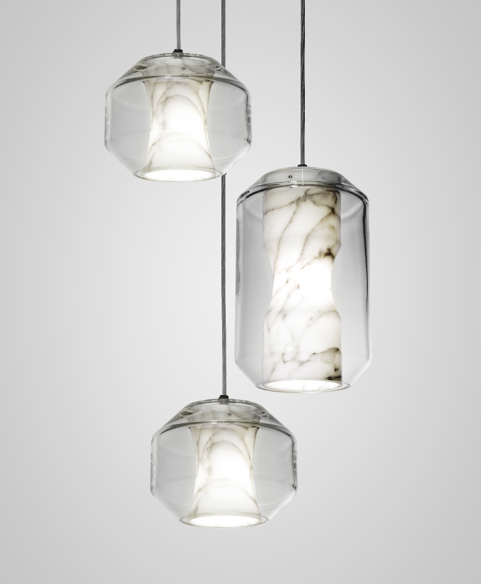 Housing a sculptural Carrara marble diffuser within a lead crystal vessel, Chamber expresses the unexpected translucent qualities of marble in a compelling decorative pendant. With its gentle luminosity and directional downlight, Chamber is available in two sizes & lends itself to being hung in clusters as well as individually.
