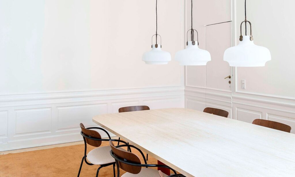Space Copenhagen’s ambition was to design a lamp with a simple industrial feel, but which was still elegant and poetic. The Copenhagen Pendant is an exercise in contrasts. Combining the classic and the modern, the maritime and the industrial. The series started with one pendant in three sizes in 2014 and was extended in 2018 with two table lamps, one wall lamp and one floor lamp.