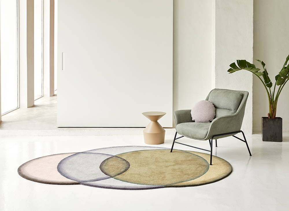 Charlotte Lancelot, a regular collaborator of GAN, proposes with her new CRYSTAL collection a game for the visual perception of the observer. Coloured circles seem to overlap in motion creating a three dimensional illusion and making room for different colour gradients. This is how wool, thick and resistant, recreates the transparency of glass in a series available in three colour variants: Neutal, Red and Blue.