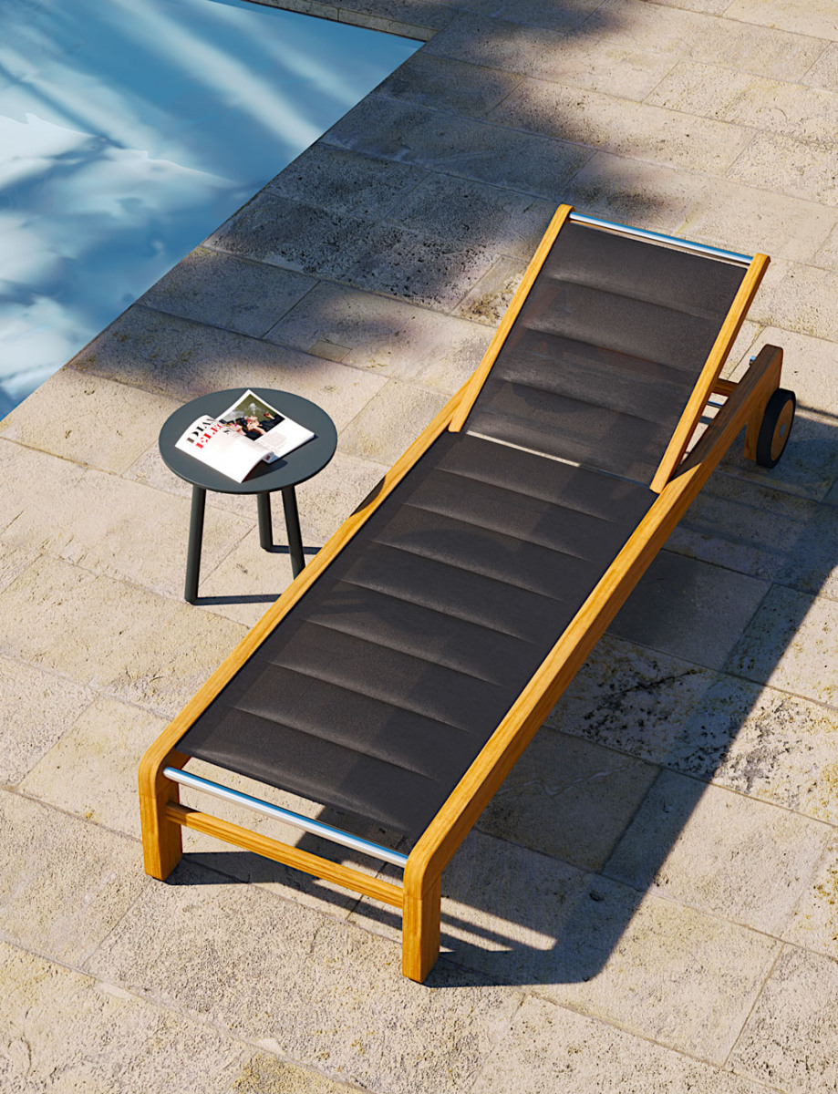 It’s an ally of relax and conviviality, as its name suggests. Dakota in a Teak chaise longue with clean and minimal design, conceived with a teak structure, seat in textilene available in two different colours. Details in 304 steel.