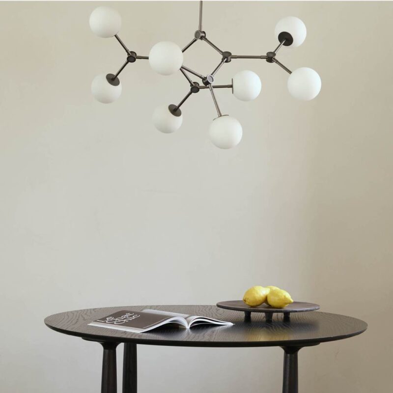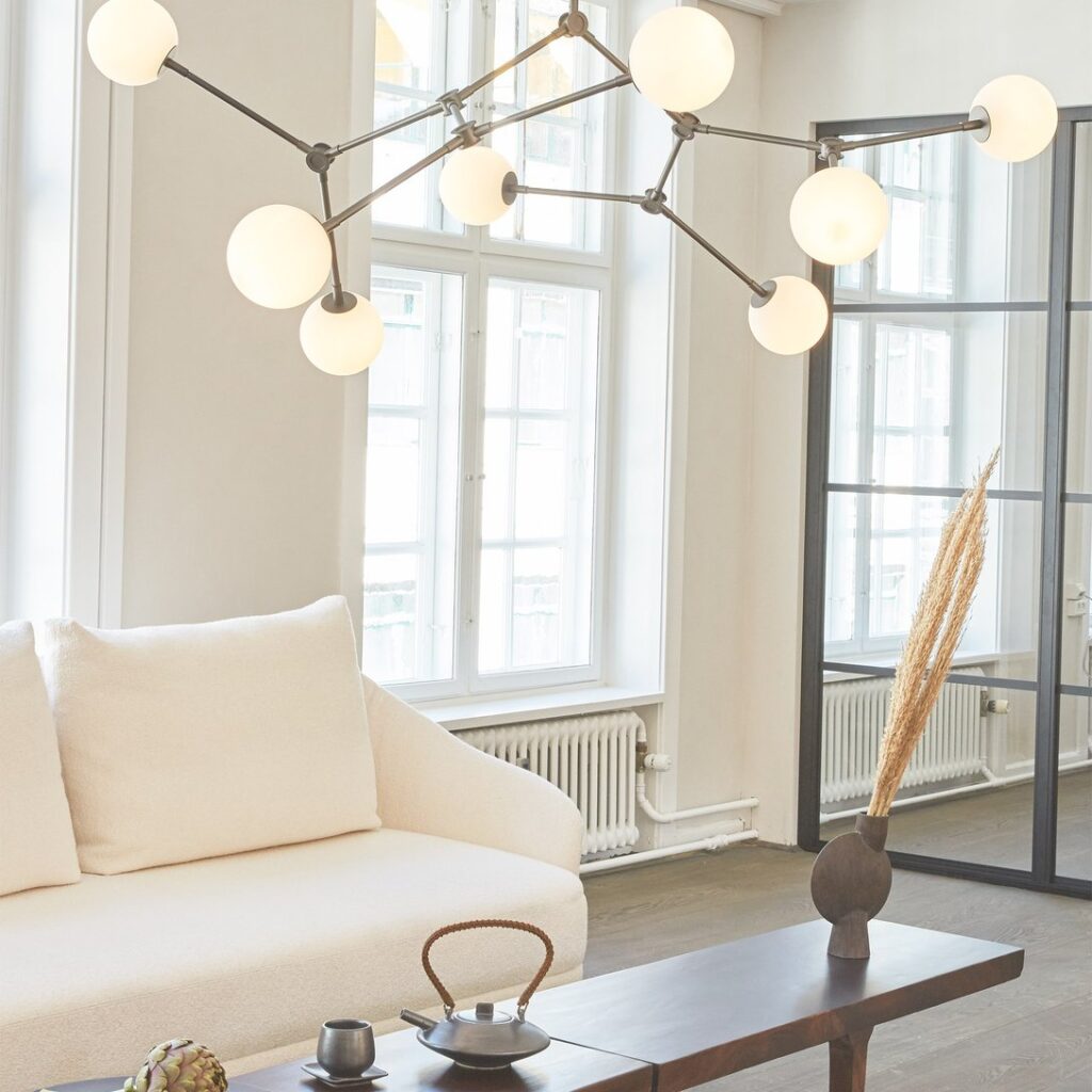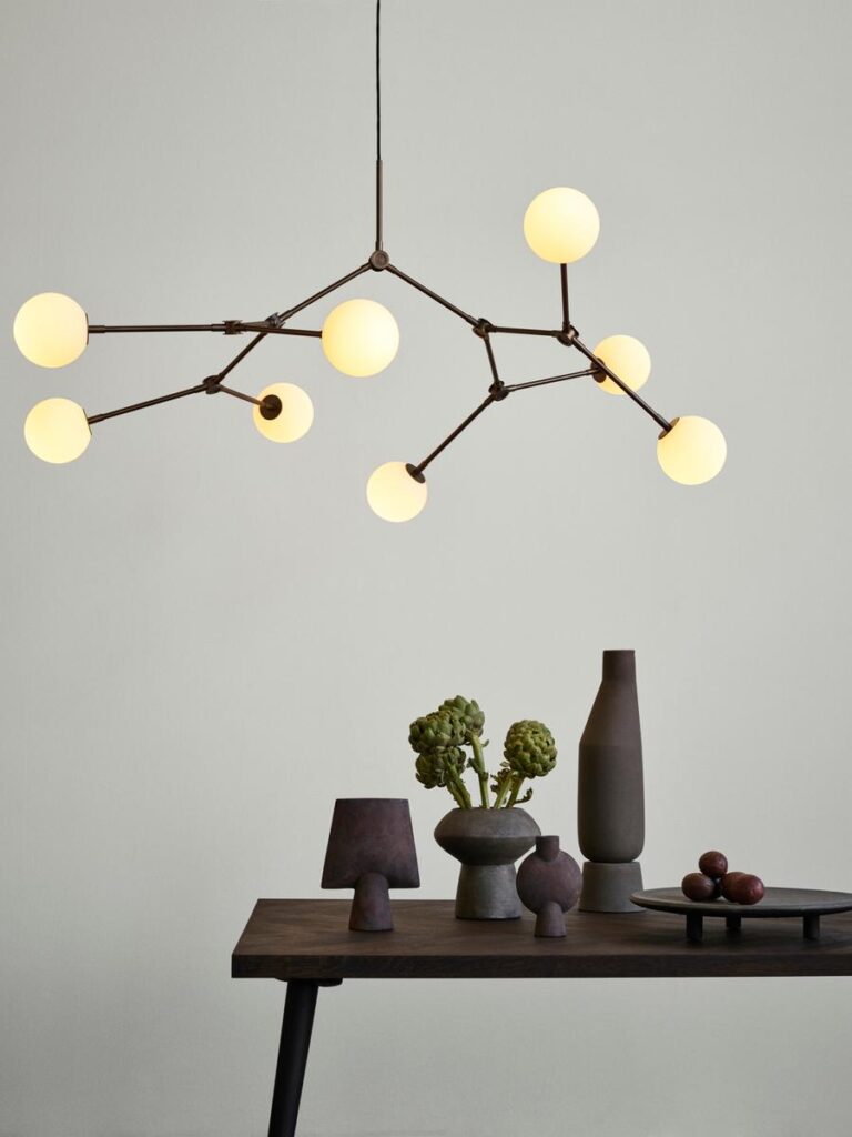 The Drop Series is a family of drop shaped lampshades, with great flexibility through adjustable lampshades. The lamp is inspired by Danish Modernism and the 1950s iconic and experimental approach to lamp design. The drop shaped lampshade ensures and optimizes light diffusion, while the underside of brass gives the room a warm lighting. The Drop Pendant Bulb takes the extravagance from the chandelier version and creates a warm light that we here in Denmark refer to as “hygge”. The drop shaped lampshade can be adjusted in multiple different angles, enabling the user to create a specific and unique atmosphere.