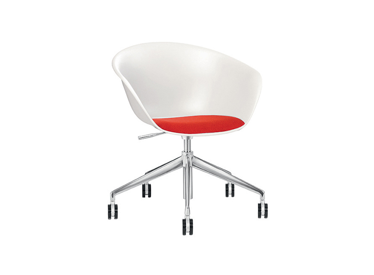 Chair with polished aluminium five-star base, mounted on self braking castors and fitted with gas mechanism. Please ask in store for colors and frames.