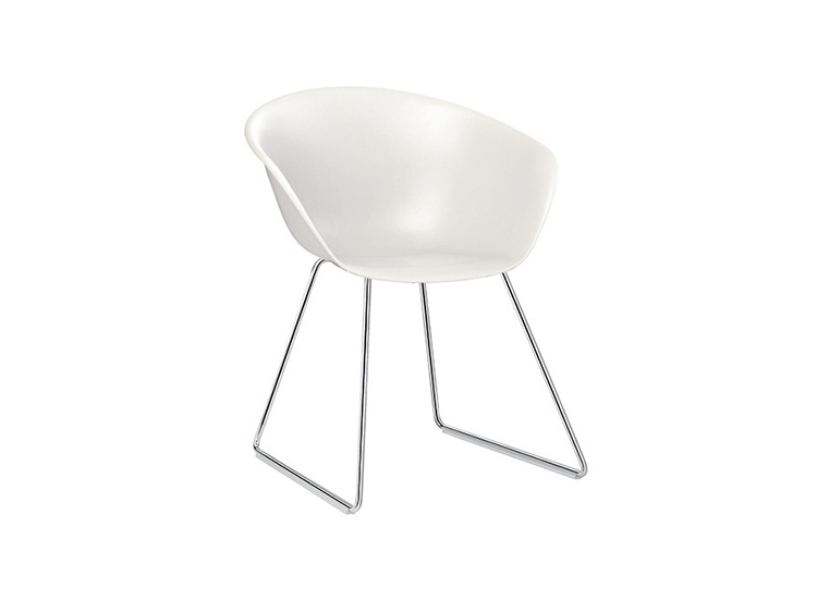Armchair with sled base, in chromed steel. The shell is available in polypropylene in six colors, with cushion, front face upholstery or fully upholstered in leather, faux leather, fabric or customer’s fabric.