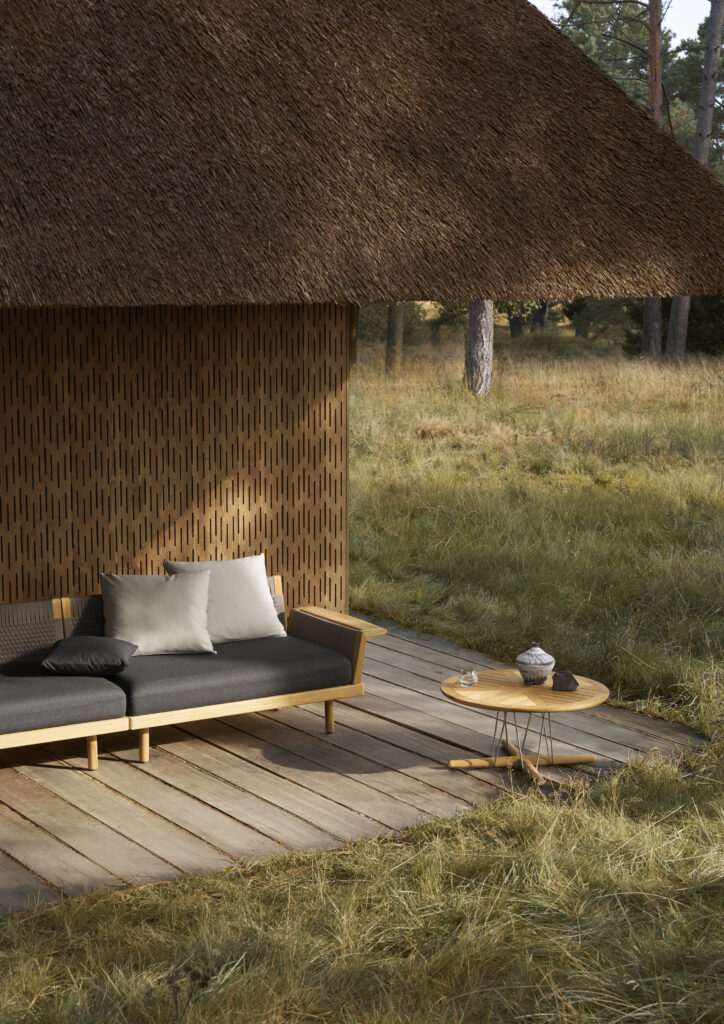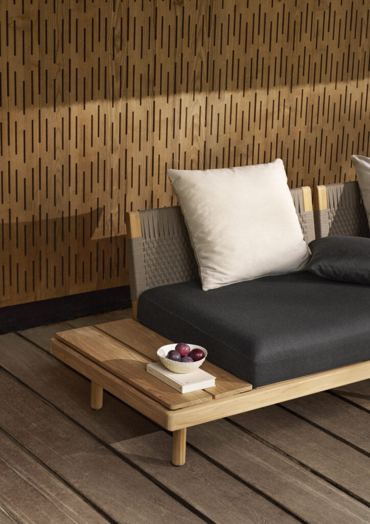 The Embrace Outdoor Lounge Sofa is a flexible, modular design featuring a solid FSC-certified untreated teak frame and soft upholstery. A hand-woven flat rope back and armrests support soft upholstery in a range of earthy colours. The sofa is fully customisable and can be freely combined from seven standard modules.
