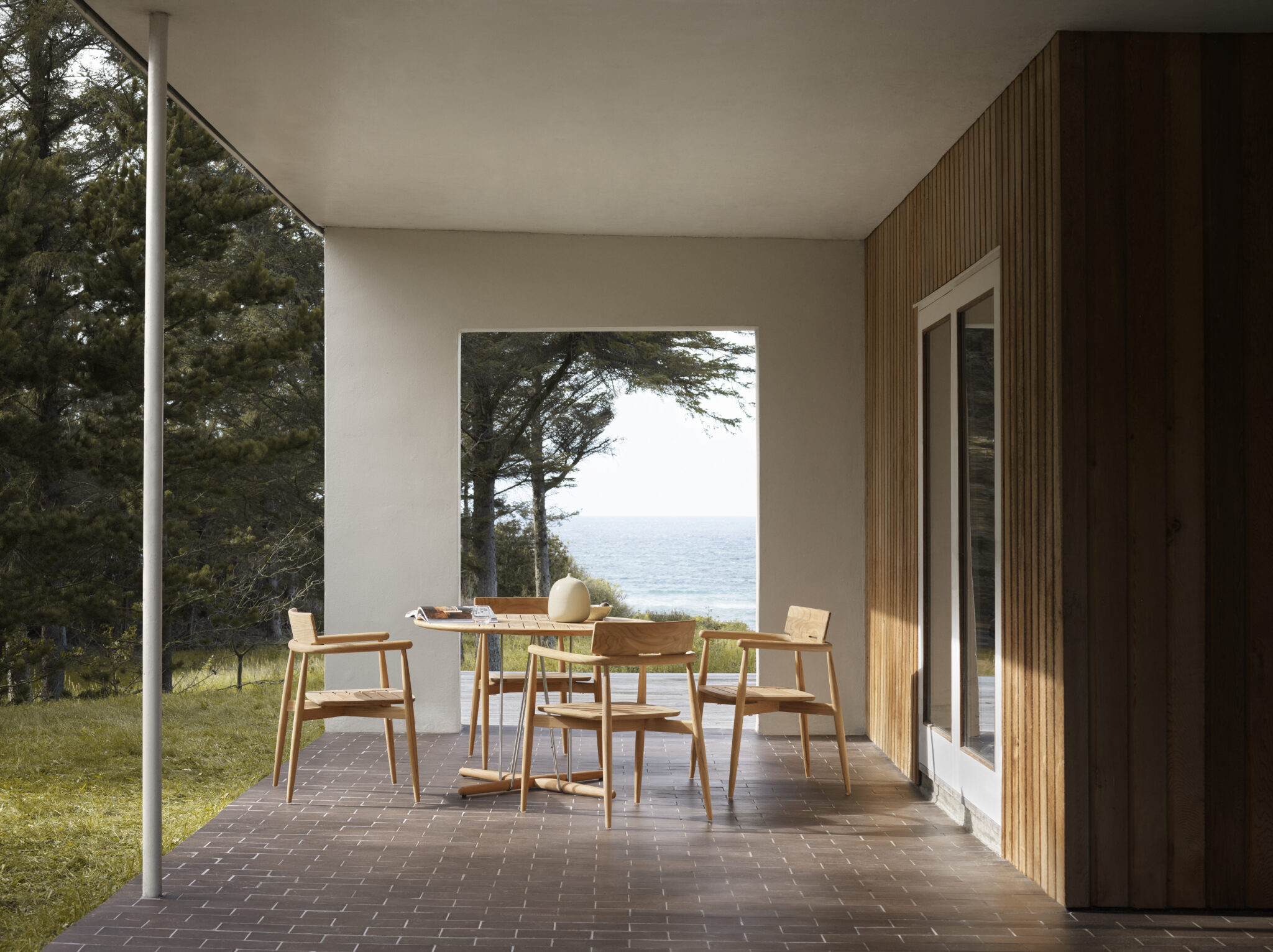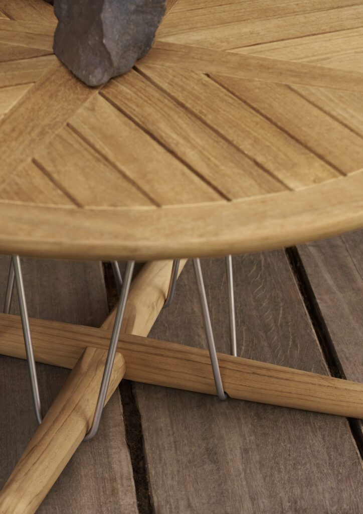 Extending the contemporary Embrace Series for Carl Hansen & Søn, the design trio EOOS presents the E022 Embrace Outdoor Dining Table. The round table in untreated teak seamlessly continues the silhouette of the indoor Embrace Series. The contrast between a sturdy steel wire suspension and a solid wood base and tabletop gives it a dynamic expression that brings the comfort of indoors into the garden. A small (Ø80) and a medium (Ø110) and large (Ø140) sized table are available.