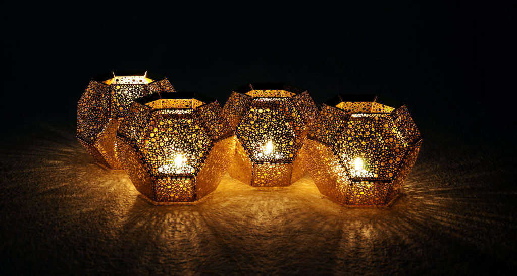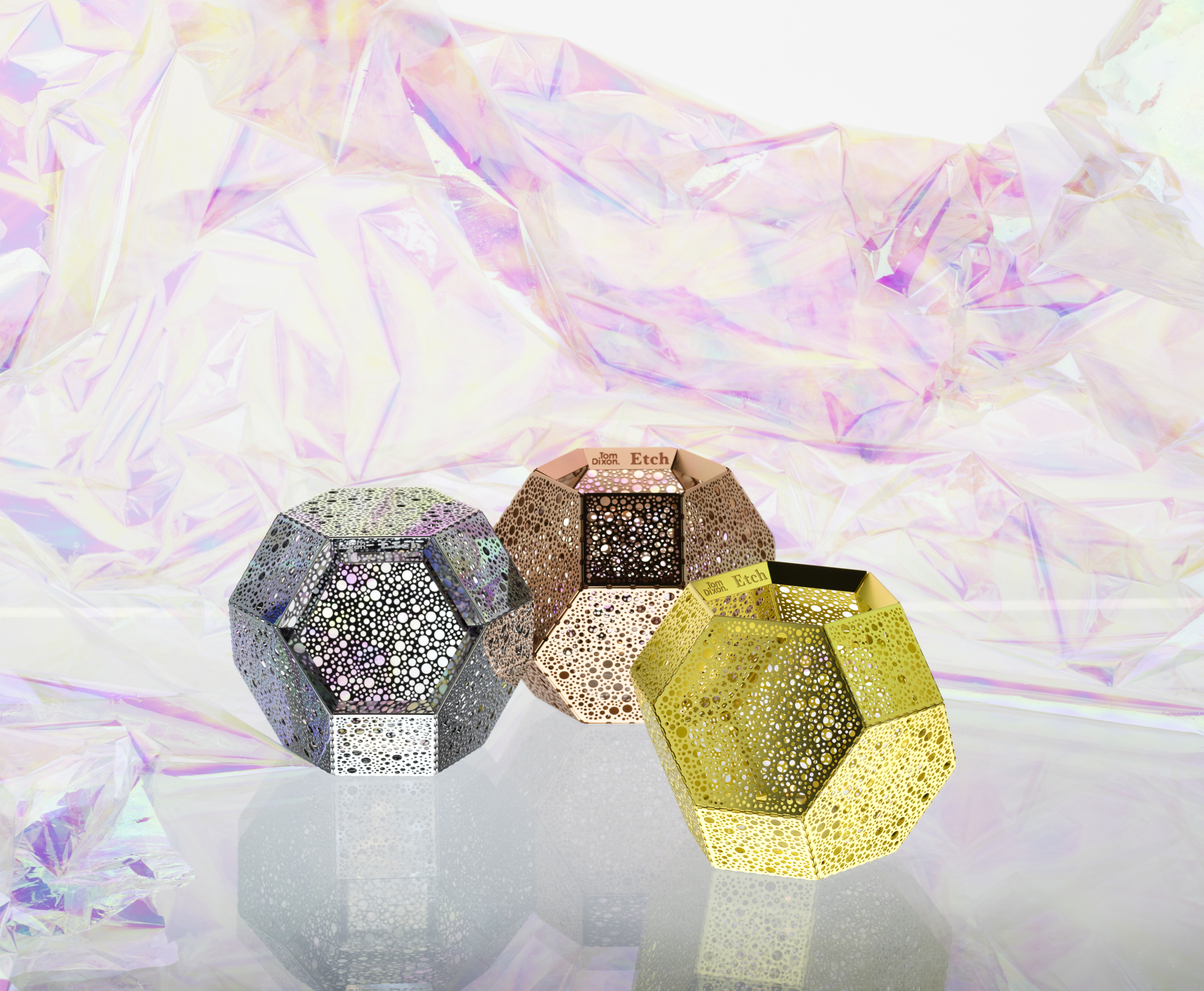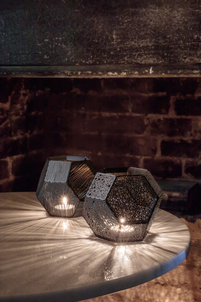 Giving out a soft, ambient glow when lit from within by a candle, our much-love tea light holders are etched from metal in the same way as their lighting pendant counterparts. Available in brass, steel, copper and black and with an alternative wood surface pattern.