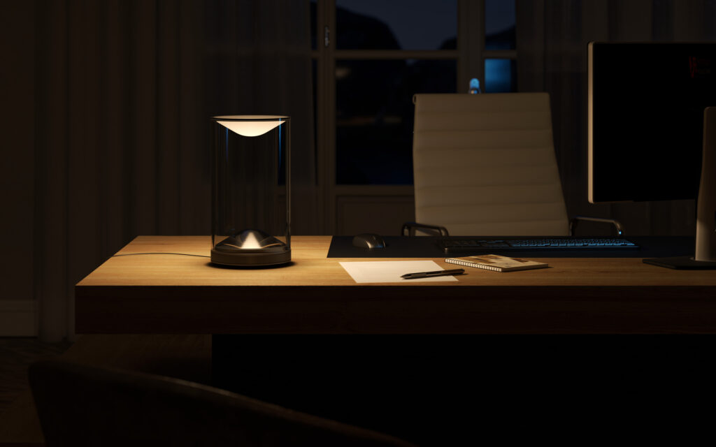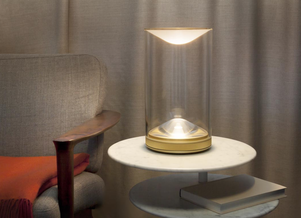 The Lumina Eva is a tabletop indirect up-light. The entire assembly sits within a glass tube with a round mechanised aluminium base housing a single LED. The LED projects light upwards onto a reflective cone. Wrapped around the base is a grooved, free-moving wheel that works as the dimmer. Table lamp for indirect lighting with a 18 W LED source; light intensity is adjustable through a rotating dimmer. Aluminium structure with transparent glass diffuser.