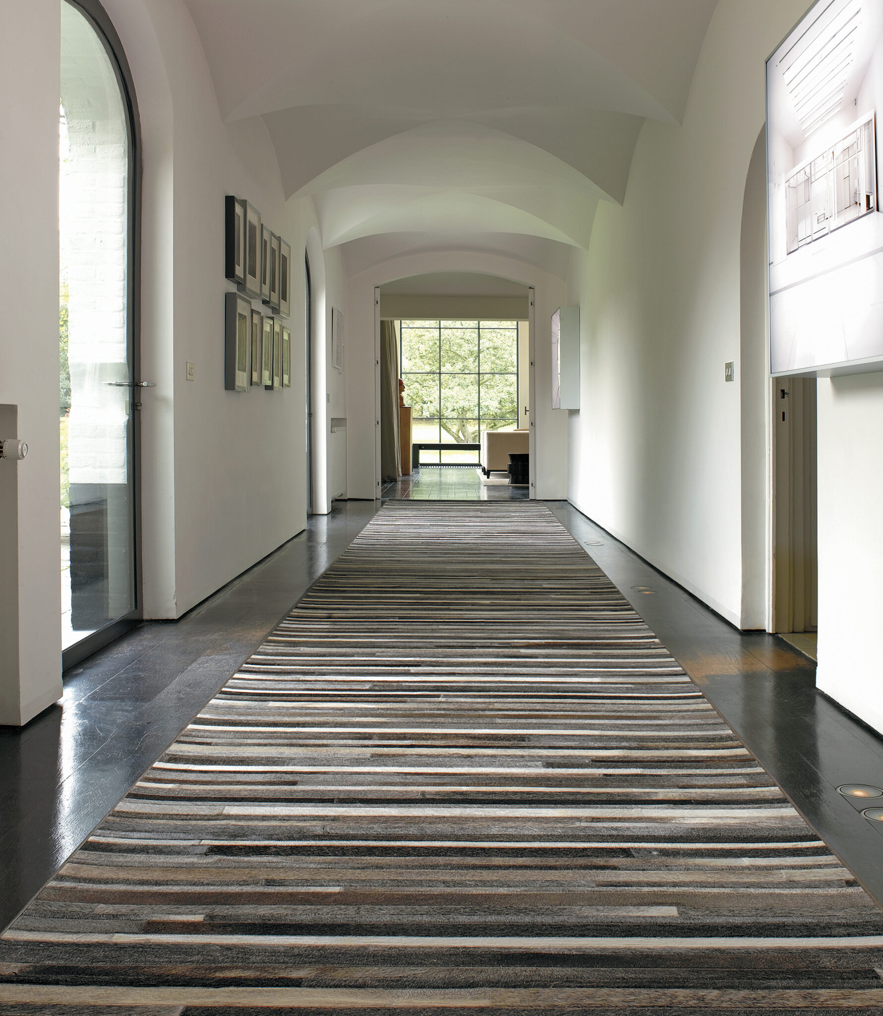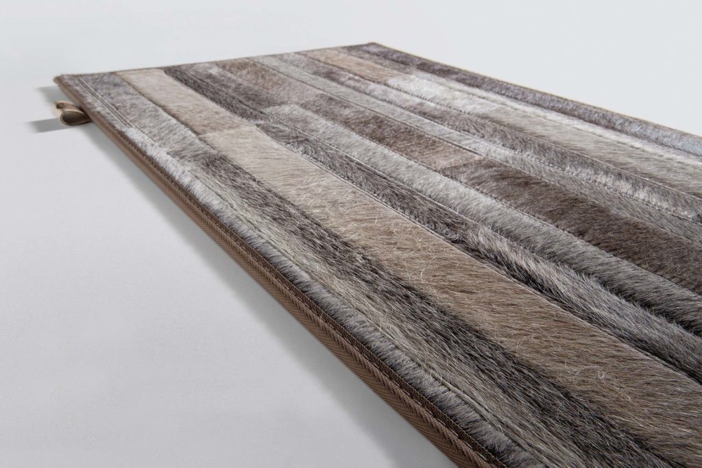 The beauty lies in its simplicity: natural grey shaded leather strips, hand-stitched together, to create a contemporary floor covering.