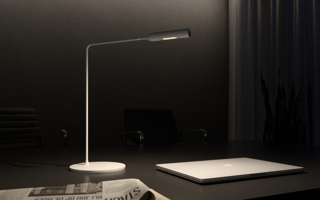 The Flo range of lights is the result of Foster + Partners’ first collaboration with specialist Italian lighting manufacturer, Lumina. This minimal light integrates the latest dimmable LED technology within a streamlined, curving form. The cold-formed head and slender aluminum frame are balanced by a circular aluminum base and a delicate profile is created by eliminating superfluous moving parts, such as coils and springs. Bedside LED lamp in varnish-coated aluminium and steel. Its head rotates by 300° for direct lighting, the arm pivots on base by 120°. 3W LED which you can switch on with one click for full light intensity, with two clicks for half light intensity.