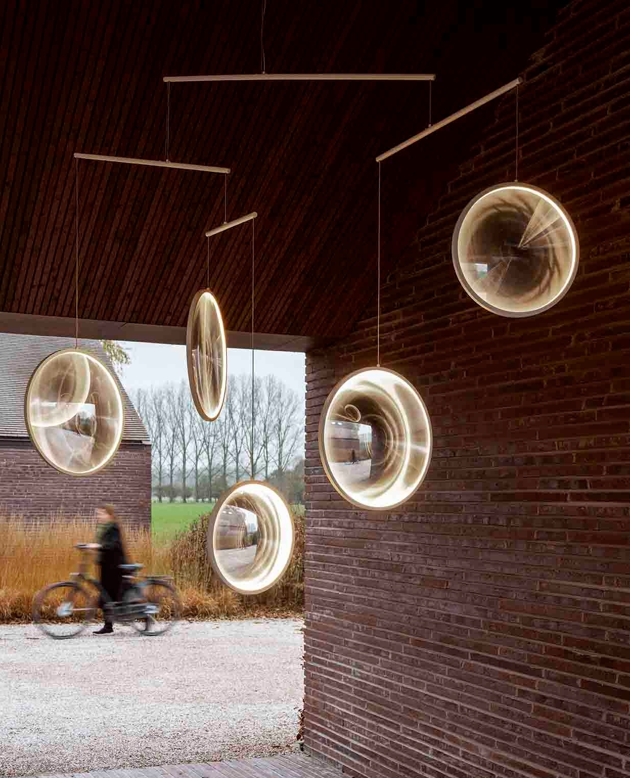 Chandelier composed either of 3 or  5 luminous discs in PMMA (acrylic glass).
