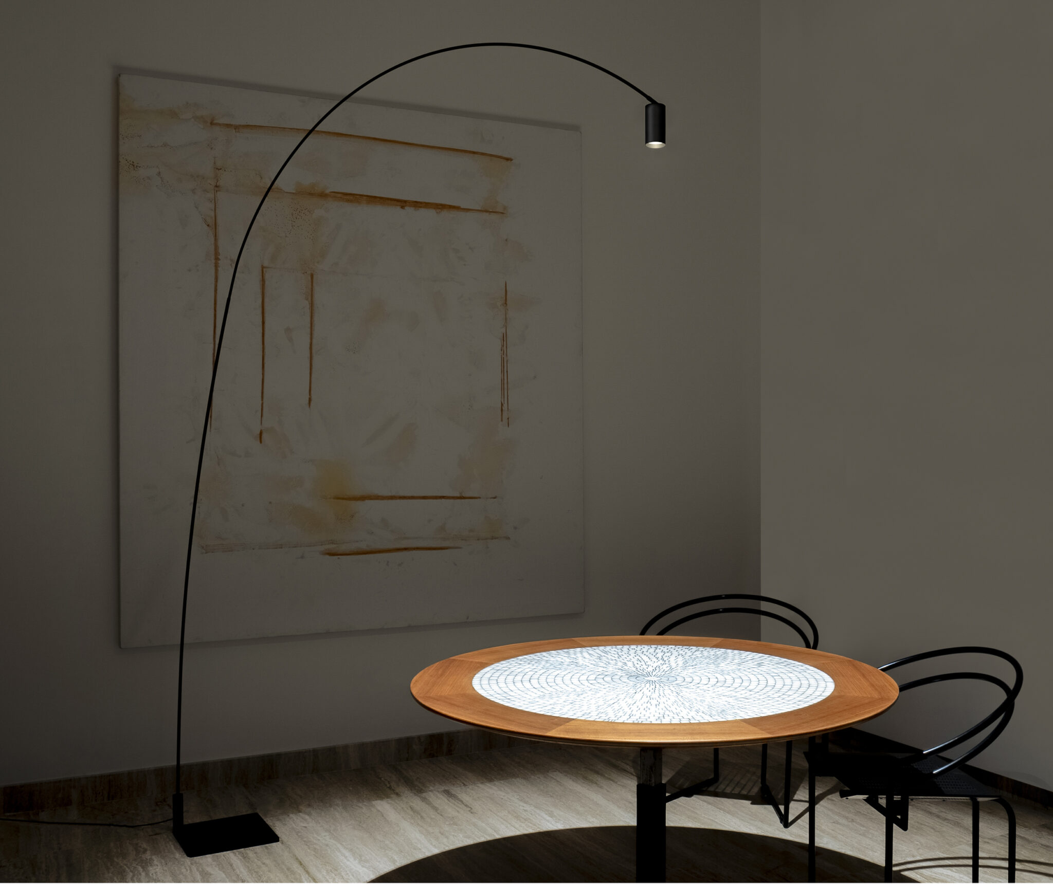 FOX is a dimmable LED floor lamp. Steel matte black painted structure and base. Aluminum spot with optional honeycomb filter for antiglare. Its slewing arc and its directable cylindric head allow to flexibly orientate the light beam for a consistent warm diffused light.
