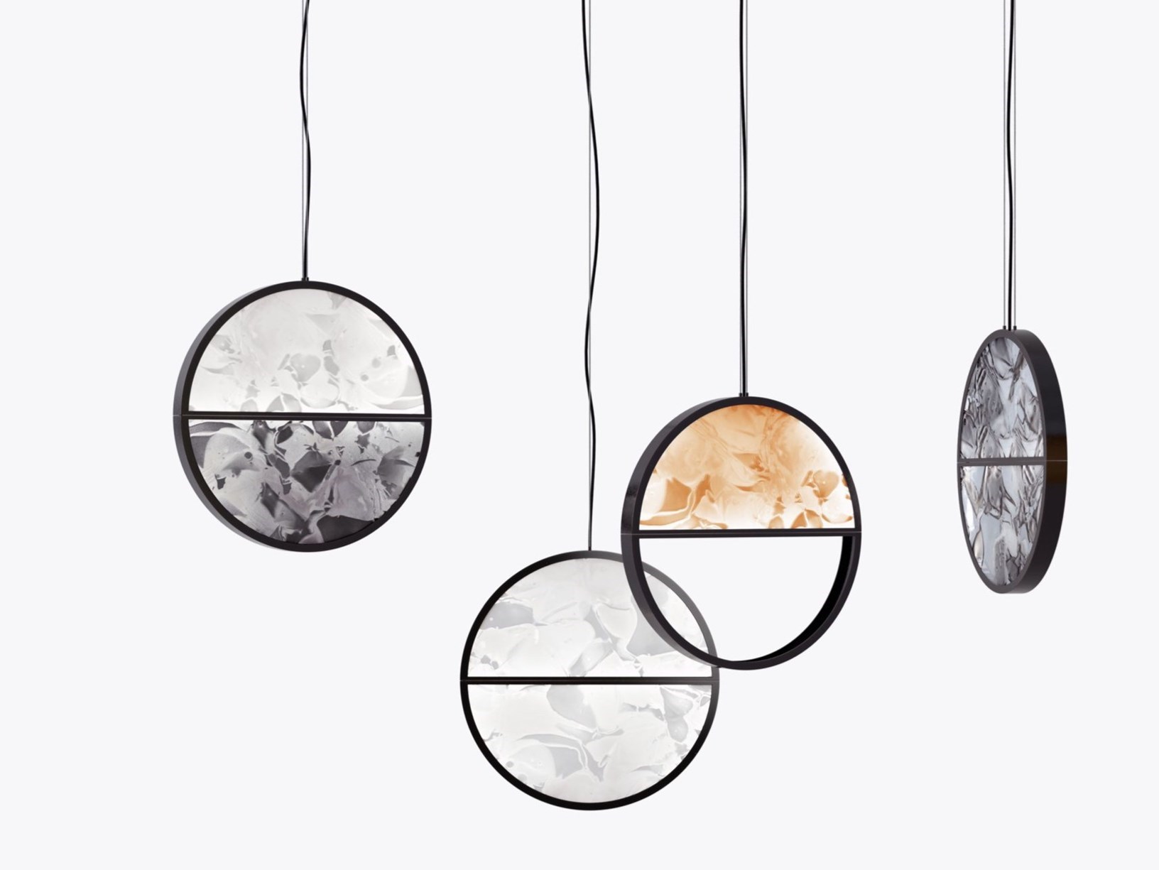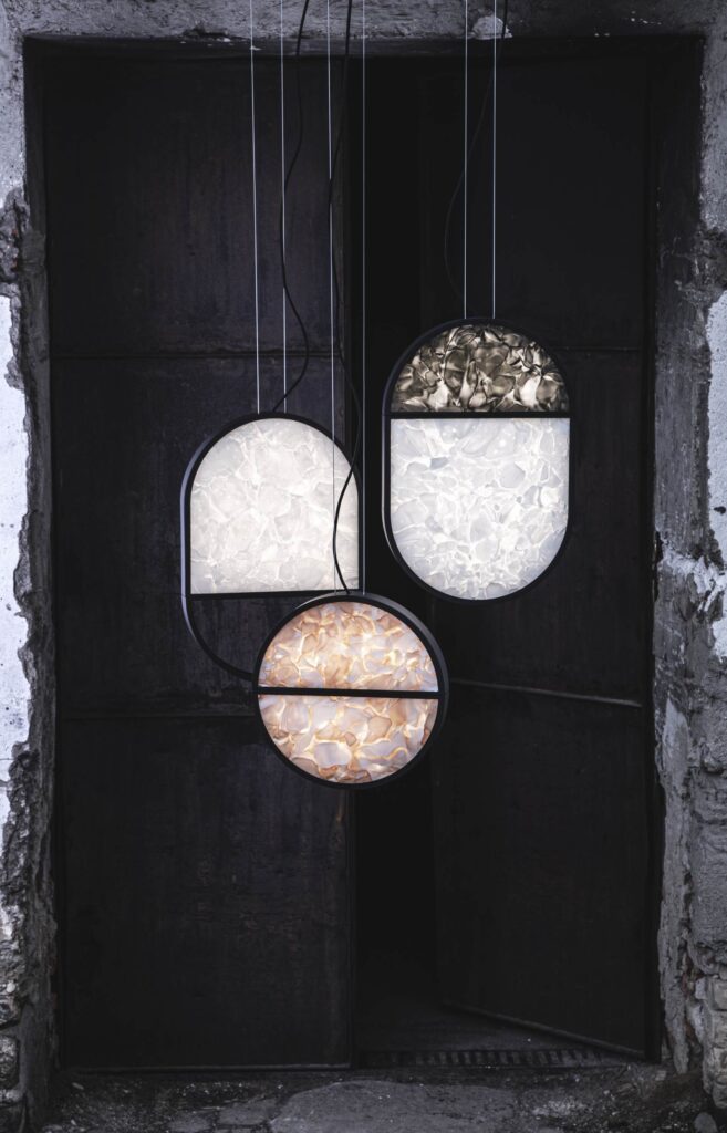 Geometric accentuates the aesthetic expression and structure of BROKISGLASS, which itself is remarkably distinctive. The collection is defined by basic geometric shapes that characterize the overall contours of the lights and instil them with a singular graphic element to achieve a striking contrast with the animate, almost sculptural makeup of the glass. The suspension components make up the glass geometric shapes, their edges rendered in black profiles.