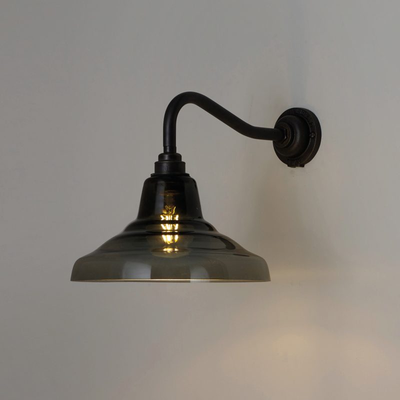 A smaller version of Davey Lighting’s classic School Light, produced in hand blown glass, and designed as a compact wall light fitting. The glass shades come in either opal, anthracite and clear glass, with a weathered brass arm and back plate. The anthracite and clear glass shades show off the filament exposed light bulb, a nod to this continuing lighting trend.