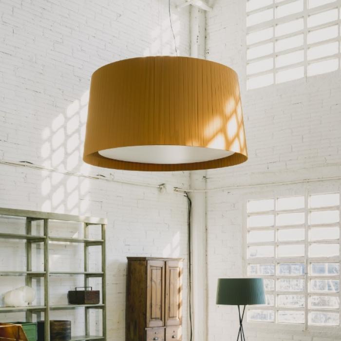 Designed for intermediate volumes and household areas, GT5 and GT6 are hanging lamps with ribboned shades whose mere presence imbues a room with character. Santa & Cole advocates the use of ribboned shades to dress up every kind of light source, exploring different materials and playing with colours and hues.