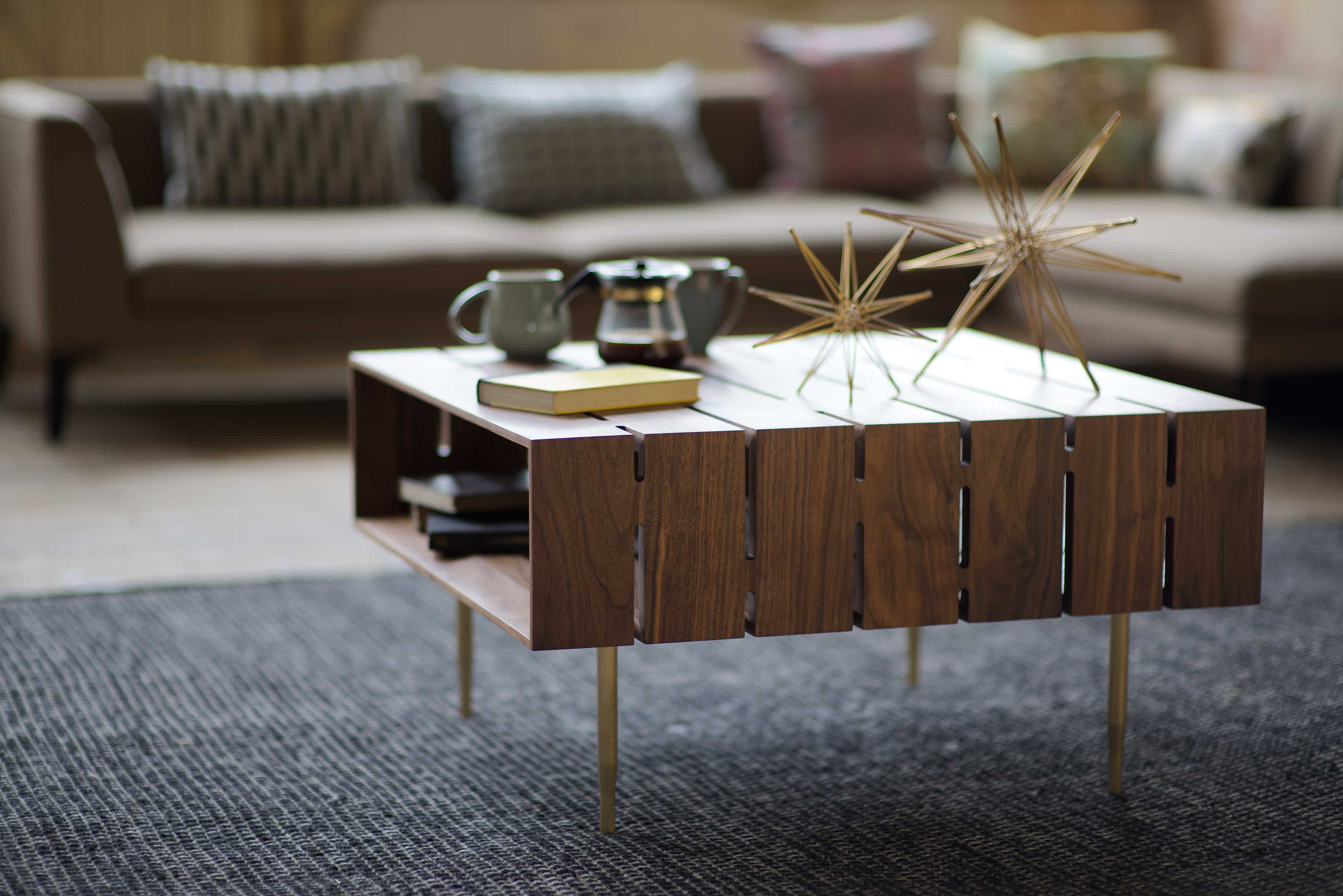 Horizon Coffee Table is an architectural solid wood design set upon solid turned brass legs. The complex joinery exploits CNC technology, and the pattern of pierced slots allow for semi hidden storage, and the passage of light. Design: Matthew Hilton