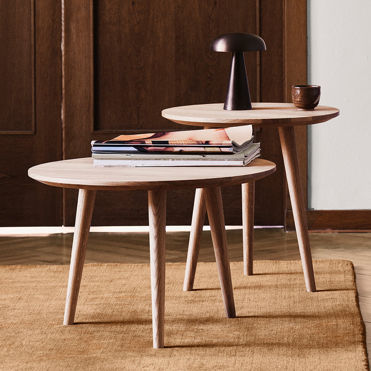 Sitting within the larger In Between series, this lounge table carefully echoes many aspects of the In Between chair, from its gentle curvature to the outward splay of its legs. It is available in two heights and comes in three finishes: black lacquered oak; oiled oak; and smoked oiled oak.
