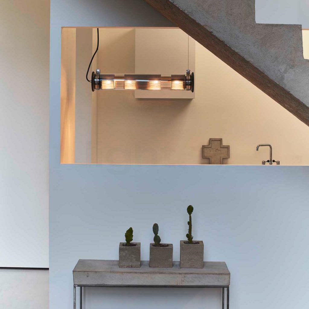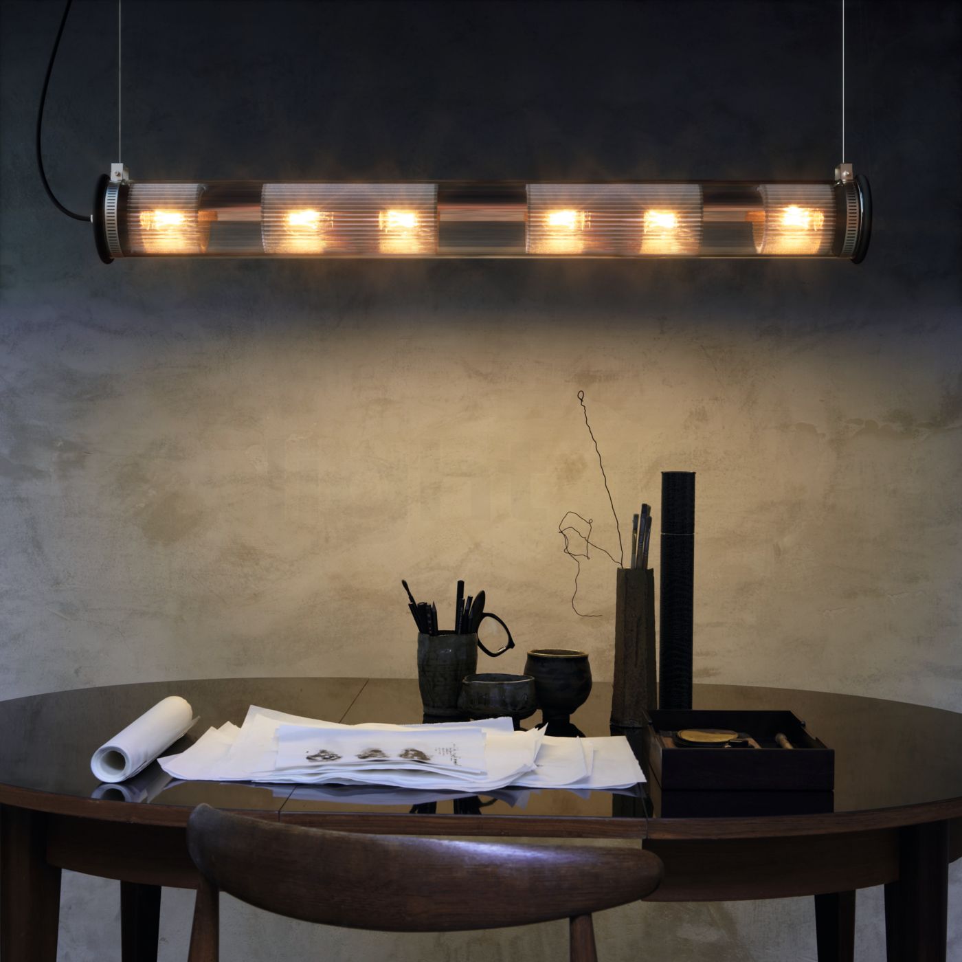 The architect Dominique Perrault and the designer Gaëlle Lauriot Prévost designed this collection — which until now has never been produced — with the objective of it being utterly original, almost indescribable, nearly unbreakable, timeless and completely durable. The « IN THE TUBE » collection comprises strong ideas, forms that are both free and constrained, and it comes in several lengths, diameters and colours. Made in borosilicate glass and closed with aluminium stoppers sealed in silicon, the mountings are in stainless-steel which allow it to be used as a suspension as well as on a wall or ceiling-mount. « IN THE TUBE » diffuses a soft, filtered light that can be oriented by the movable mesh filter or by a reflector whose colour determines the light given off. The « IN THE TUBE » collection of high-performance tubes could be just as easily at home in a James Bond spy kit as it could in a Jules Verne rocket.
