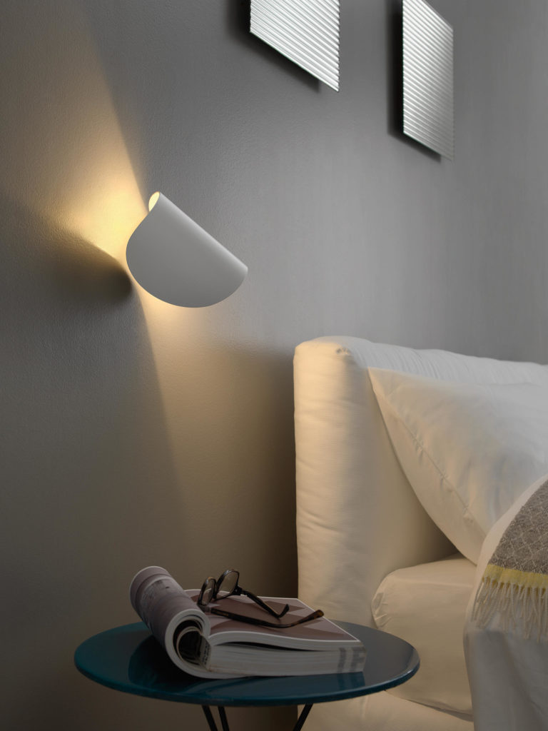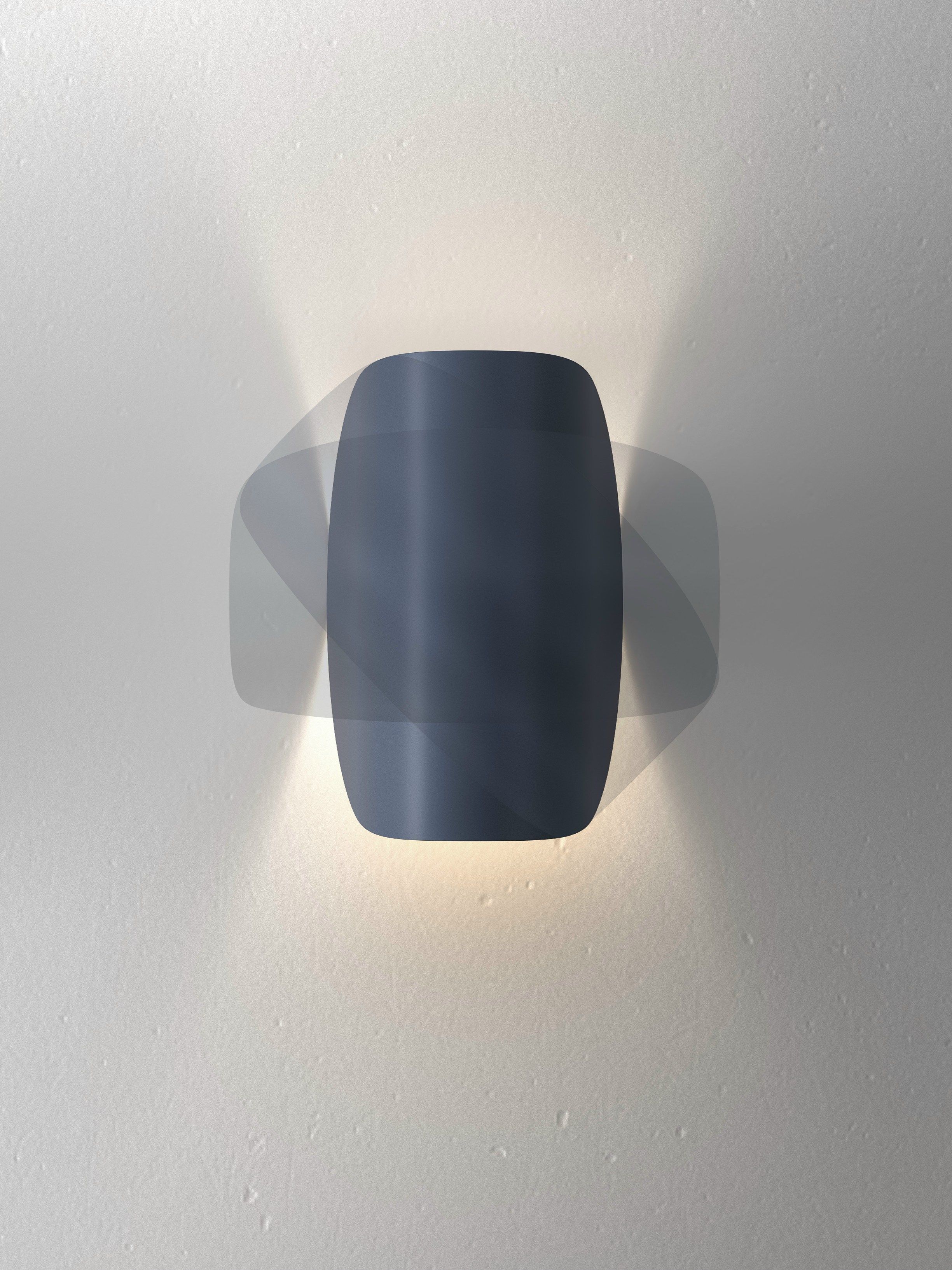 In the shape of a small curved lunar disc, IO is a wall light with dual Led light emission. IO appears almost suspended, very close to the wall but never close enough to touch it; positioned at a distance that allows the light to gently caress the wall with an intimate skimming effect. Elegant and minimalist, it is equipped with a mount with a dual rotating axis. is allows the diffuser to be rotated by 360°, directing it exactly where the light is required. In addition to rotating, the diffuser also moves up and down, opening and closing the light beams to adjust to individual requirements.