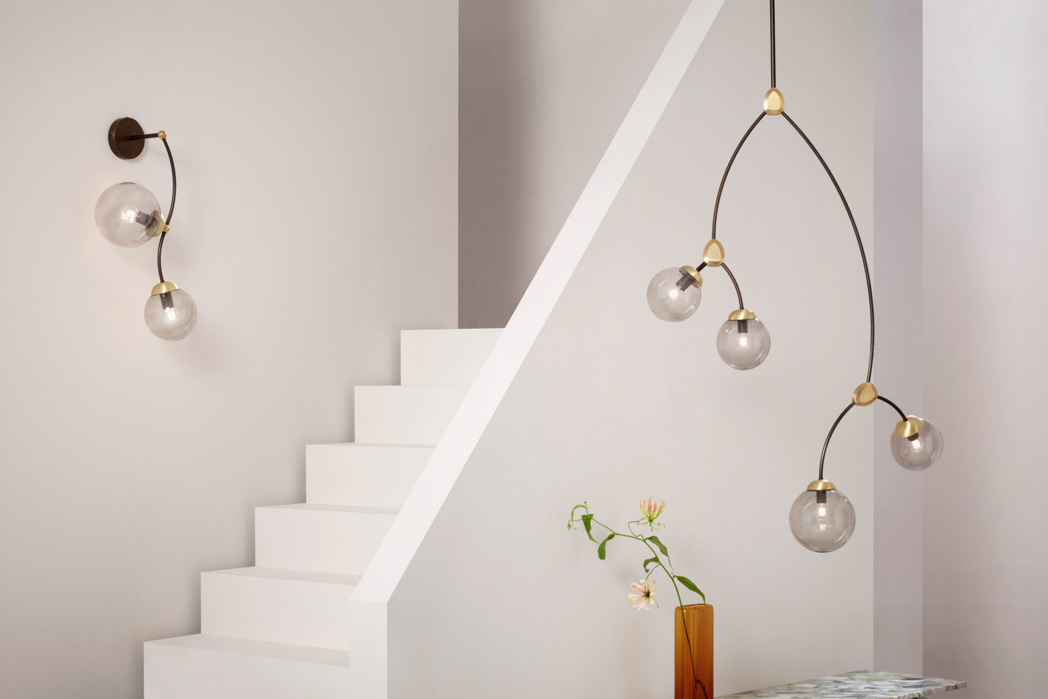 The bronzed metalwork is curved and lit with a choice of opal or smoked glass shades. These sculptural pieces give designers new opportunities for lights to be used in less static compositions.