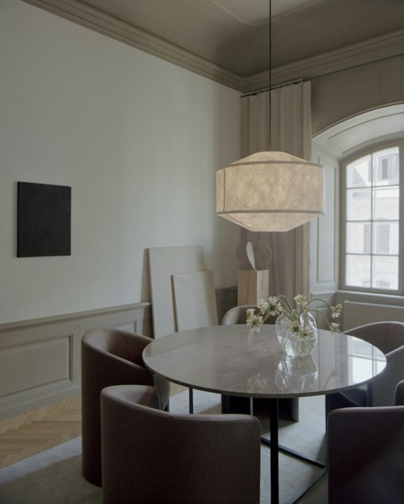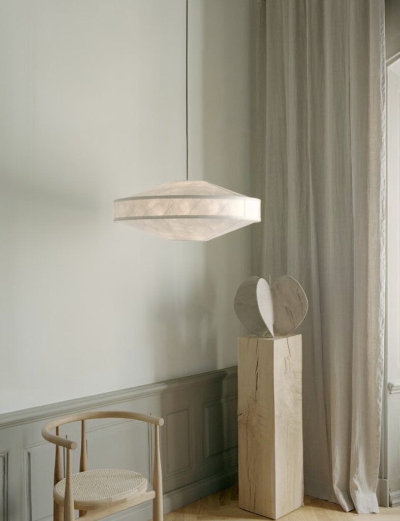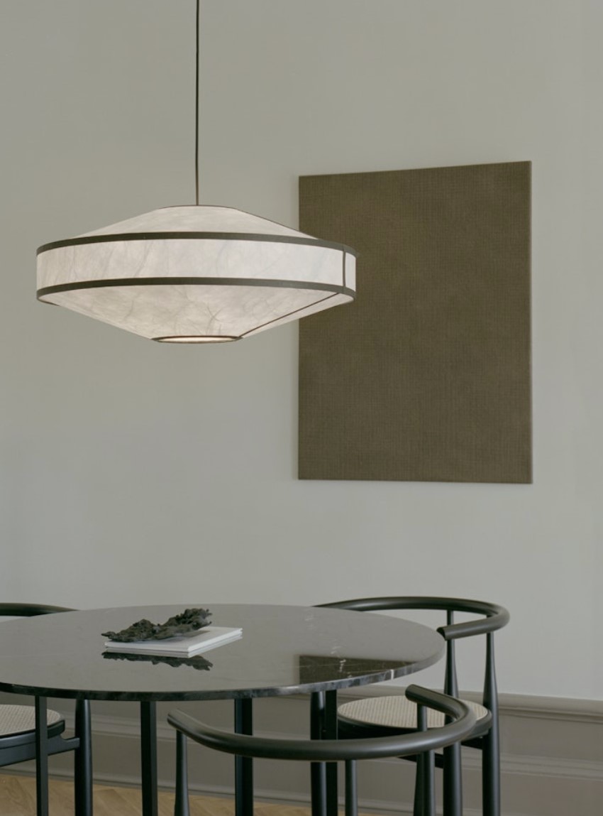 Kite is a work of proportion and abstraction, blending pure and geometric silhouettes with smooth, textured materiality. The same structural elements are adapted into three different sizes, each echoing the other like a tale that alters subtly with each retelling. Delicate taping contours the silhouettes, a technical refinement that enriches depth and contrast. Whether displayed together or separately, the Kite Pendant Lamps serve as a luminous sculptural element.