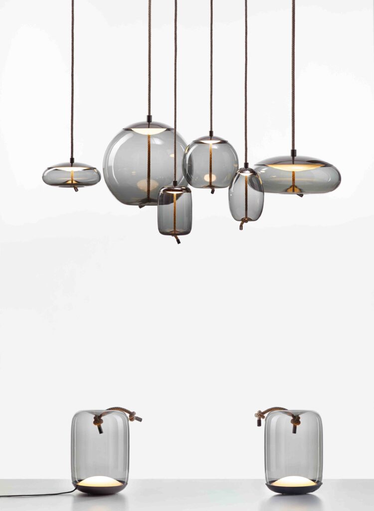 KNOT is a collection of stately lights that appose two dramatically dissimilar materials. The design combines coarse natural fibre with smooth, transparent handblown glass to arouse a contrast as striking as it is dignified.