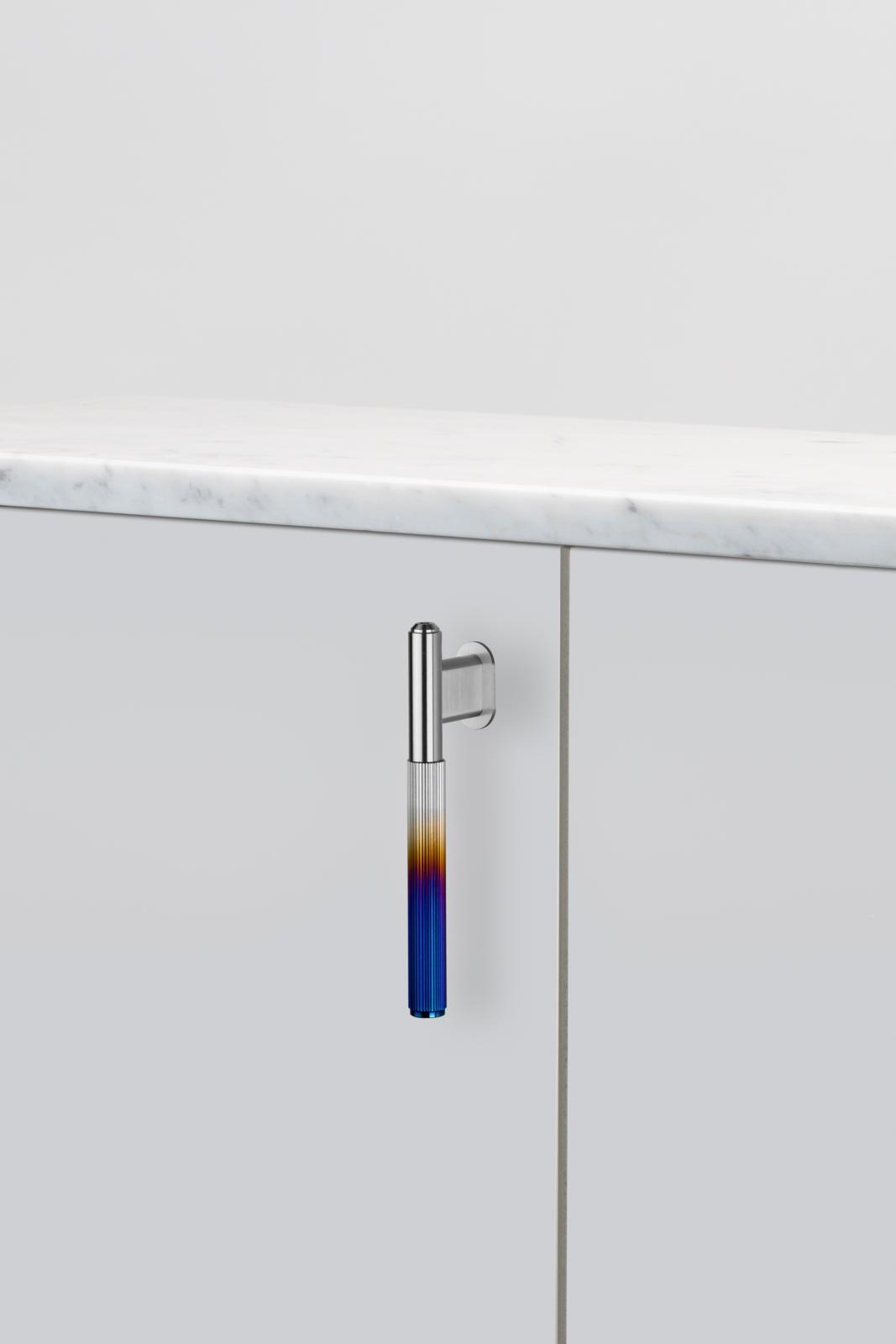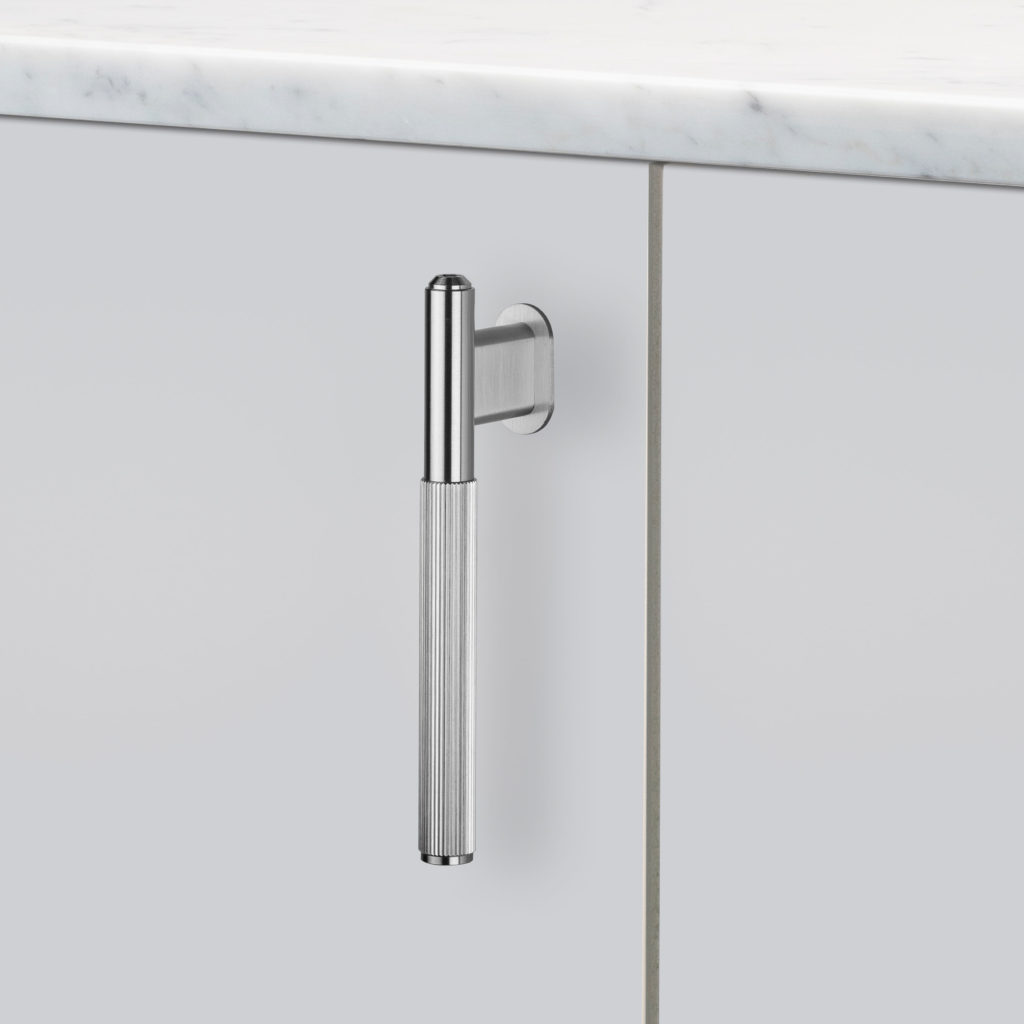 An L-bar made from solid metal and featuring our signature, diamond-cut, linear knurl pattern. Finished with a precision milled base, backplate and torx screw detailing.