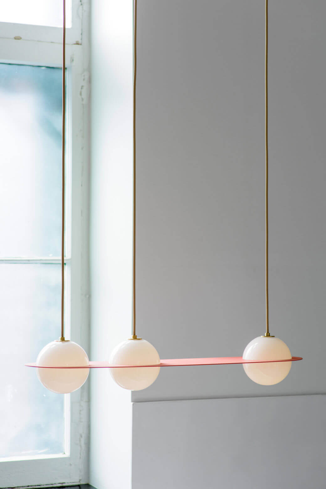 The Laurent Collection distills the milk globe to its essential relationship between circle and sphere. A series of thin forms compliment the Laurent globes—forms that carve through space, moving between line, surface, and volume. These forms combine in endless patterns, making it possible for an installation of Laurent lamps to inhabit any space with subtlety and quiet strength.