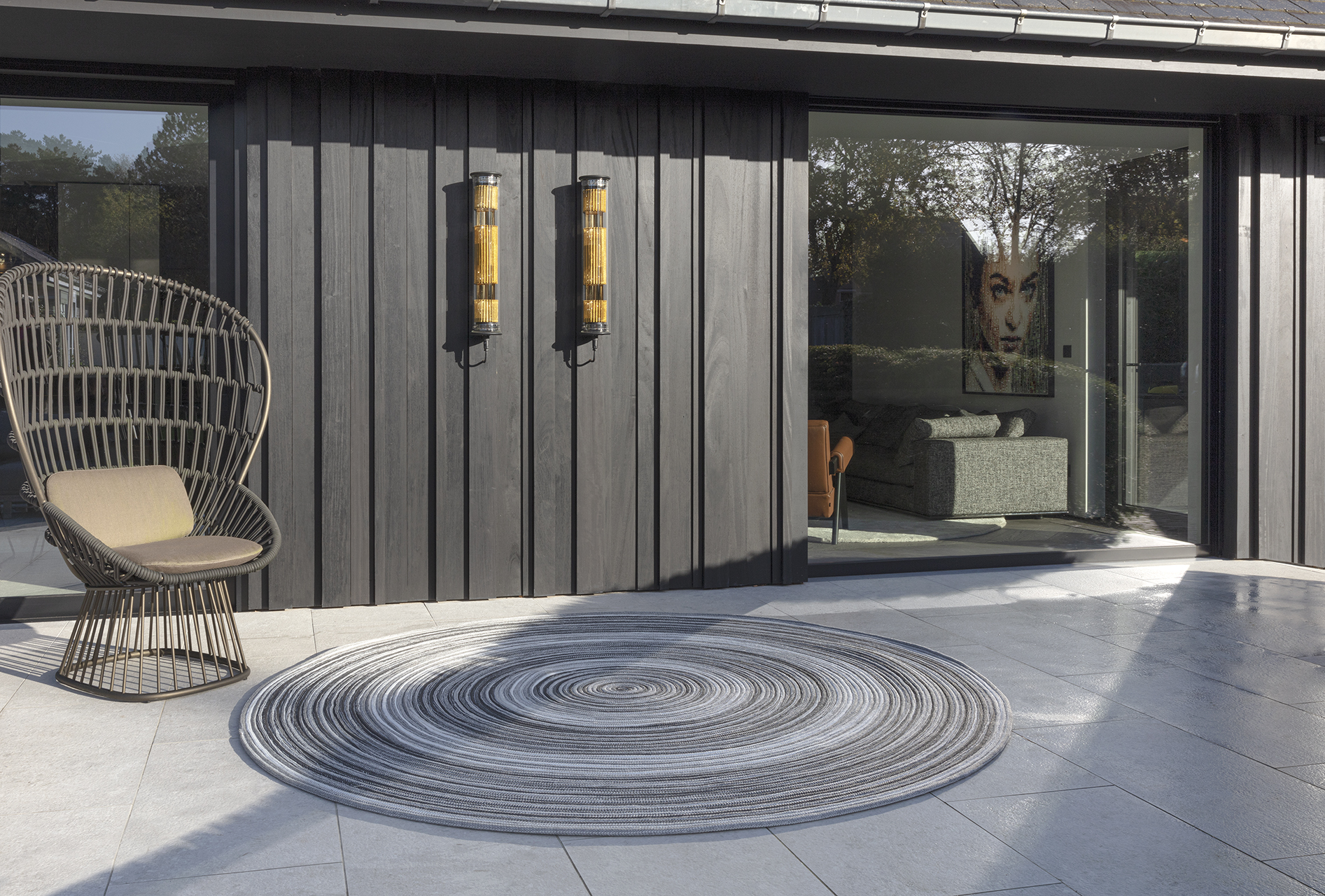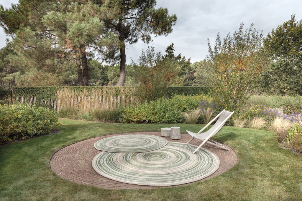 Each rug in this collection is a harmony of hues, reminiscent of tranquil green meadows, warm sandy beaches, or dancing ocean waves. The contrasting light and dark lines are created through the principle of circular knitting and the inclusion of four robust colours. They are then sewn together, interchanging the light and dark strings to create eye-catching rectangular and circular shapes that will transport any outdoor space into a world of its own.