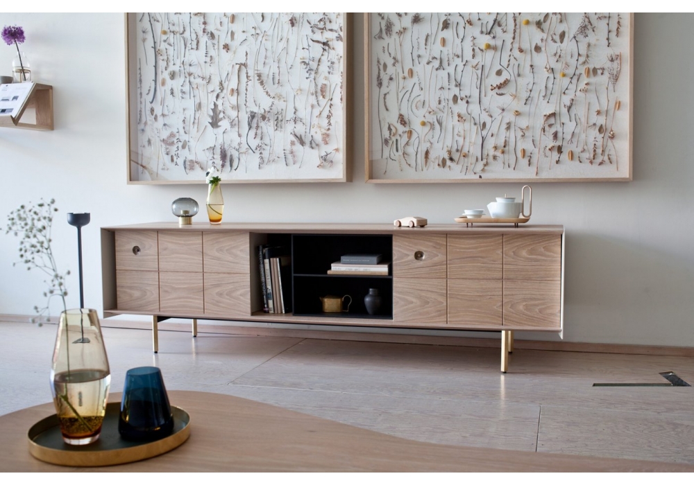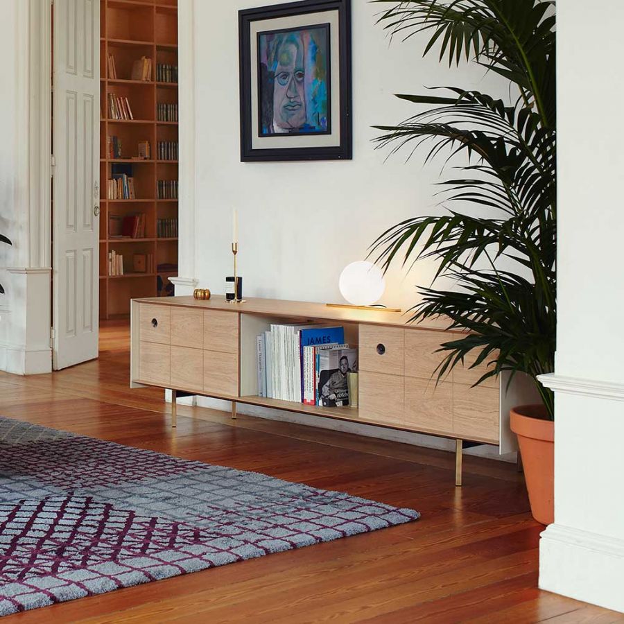 Available in American black walnut, American white oak, or European Ash in a range of finishes. Frame in painted HDF in a choice of our full range of colours with a satin matte or gloss finish. One internal storage box in black dyed wood composite with an oil and wax finish. Four sliding doors (two on each side). Burnished brass detailing.