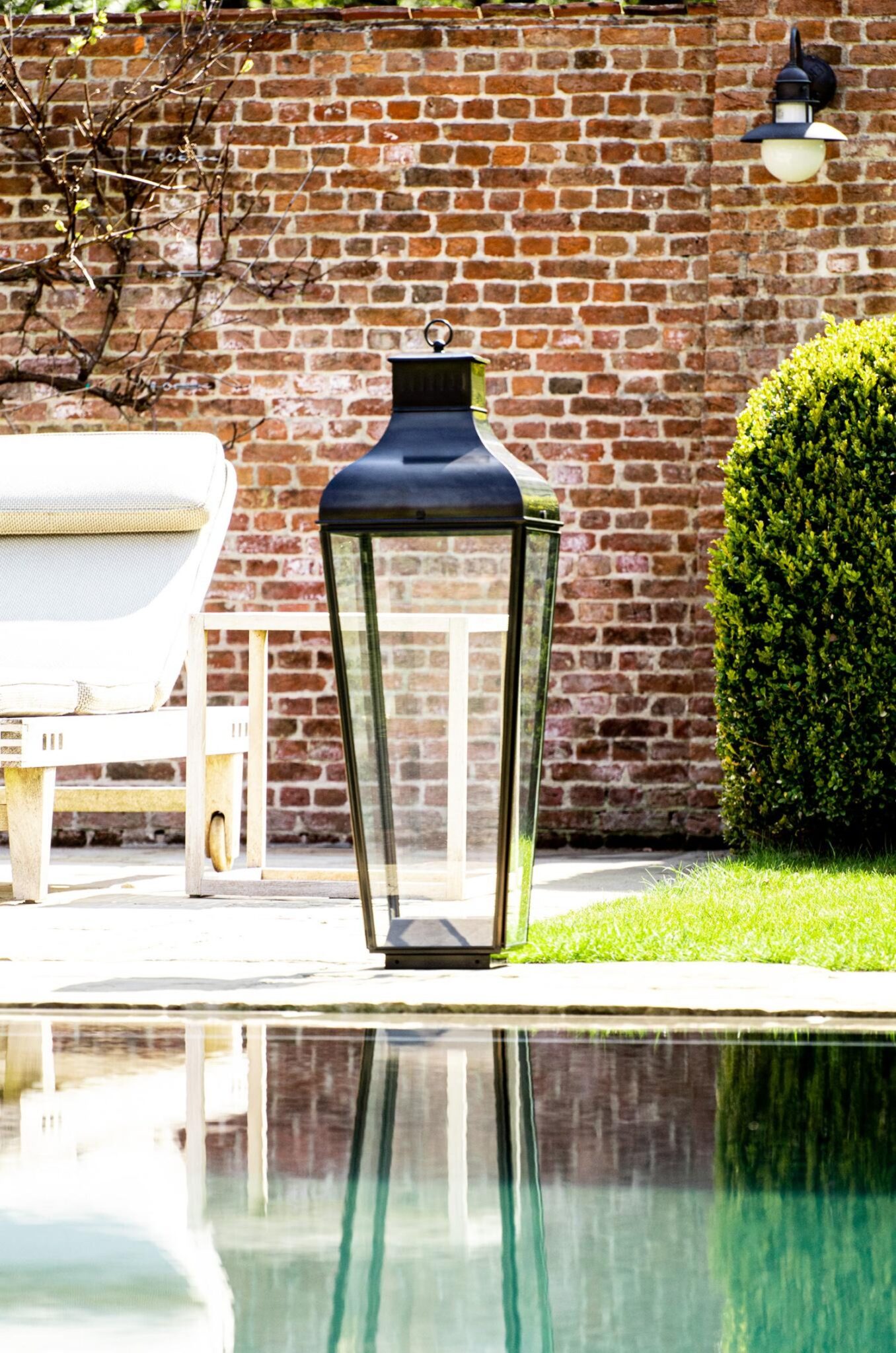 Floor lantern with pagoda structure and handle (eyelet) with outside fitted clear glass, indirect lighting,
